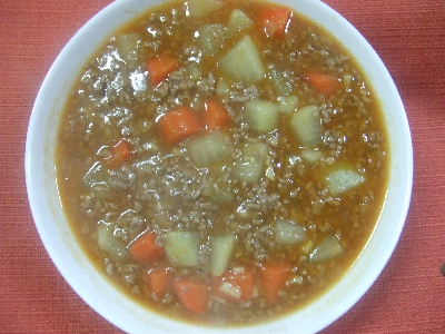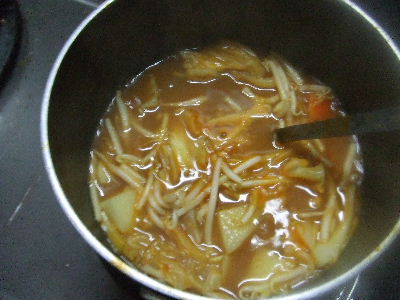 突然ですが、食べ終わって鍋にこびり付いたカレーをどうされていますか??普通は、新聞や紙パックを使って、こそげ落としてから洗い流したりしますよね!!今回、それをスープにしてしまおう~~~という画期的なもの(ちょっと大袈裟ですが)すでに実践されている方もいるとは思いますが、結構美味しいスープができますよ^^鍋にお水を入れて煮立ったたら固形のコンソメ1個をいれ、野菜を煮込みながら、底や側面にこびついたカレーを溶かします。野菜が柔らかくなったら出来上がり^^ 本当に美味しいスープです!! 野菜はじゃが芋、キャベツ、もやしなどを~~余っている野菜を使って!!お水は、野菜や残ったカレーの量で調整し~~コンソメもスープの味を見て加減してください。好みでパルメザンチーズを振ってもよいかも~~~簡単に、そして美味しく、お掃除も楽になって~~一石二鳥?三鳥??(笑)もしかして、これってエコにも繋がってる??