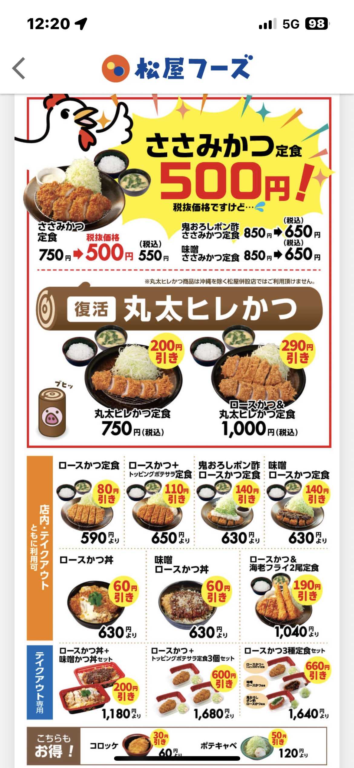 『松のや』のアプリで、ささみかつ550円(税込)‼️名古屋市瑞穂区『松のや 堀田店』へ🚗駐車場もありますよ🅿️店内です⤵️これ以外にもメニューは色々ありますよ🎶クーポンは毎日貰えるようになったみたい☺️あーーー‼️スダチドレッシングがまたまた無くなってる😭松屋にあるゴマドレッシングに変わってます‼️ささみかつ来ました‼️美味しそう♡ぶっちゃけ、松屋併設の近隣のお店より、ここの方が揚げ方が上手くて美味しいんです🙆♀️松屋併設店は定食のご飯だけおかわりOK、松のやはご飯とお味噌汁もおかわりOKです🆗スダチドレッシングとお醤油でさっぱり食べるのが気に入っているので残念です😭ドレッシング [トッパソースジャパン] TOPPA SELECTION 大分県産かぼすドレッシング 300ml /調味料 タレ ソース お土産 醤油 味噌 かぼす すだち 柑橘 ポン酢 大根冷凍スパイシーささみかつ 14袋 秋川牧園 化学調味料 着色料無添加 とてもまじめな時短 レンチン 簡単お子様のおやつ、お弁当や夕食の一品に!【メーカー希望小売価格12000円→5490円 】【松のや監修】 とんかつライスバーガー20個セット(1個135g)×20袋 トンカツ専門店のソース お取り寄せ グルメ食品 お試し おためし 松屋 受験 牛丼 肉 業務用 惣菜 お弁当 お試し まつや 非常食 米 お米 ご飯のお供 セールいつもありがとうございます♪
