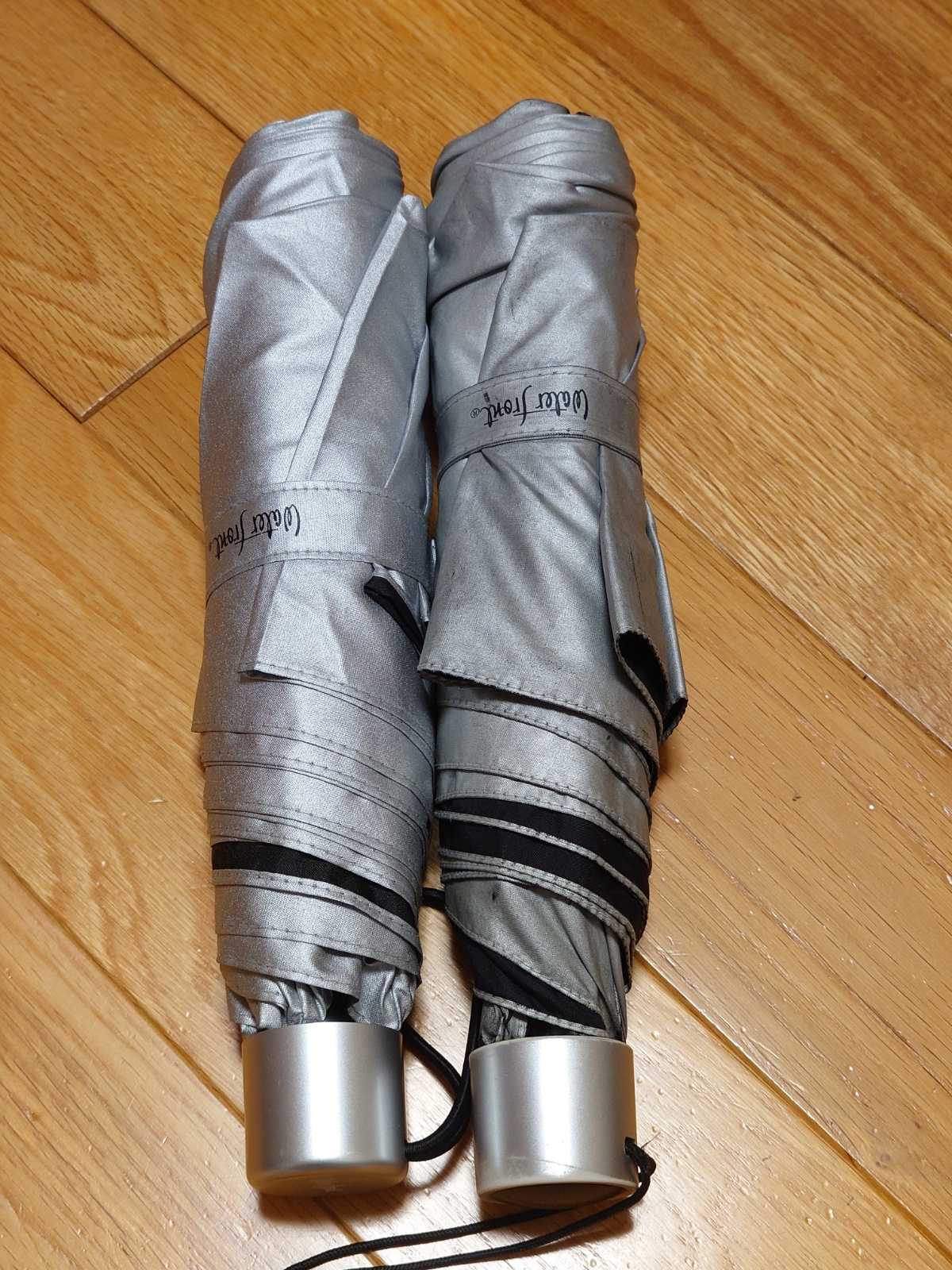 今年は日傘男子とか言われない程日傘を刺している方が増えましたね。昔から鞄には折り畳み傘を入れていたがコロナ前ぐらいから夏はちゃんとした日傘に切り替えました。それがこの銀行員の日傘(water front)です。名前からして使えそうと思い購入して使用していましたが、コレが本当に凄い!兎に角太陽光は反射してかつ内側は反射光を吸収する仕組みで今の日傘のスタンダードになっている日傘です。右が古いの、左が新しいの少し柄のデザインが変わっていました。夏はほぼ毎日使うのでかなりくたびれてしまった。可動部の軸が撮れたので応急処置をしつつ新しいモノを購入!ボロくなってきていたと思っていましたが別物?と思う程に色違いますね。柄の部分も擦れすぎて見事に地肌出ています。これだと効果も少し落ちていたかもしれませんね。作りがしっかりしているので強風にも耐えられます。完全遮光するので体感温度はかなり違います。裏側が真っ暗なので反射光を吸収してくれます。影も真っ暗です。昼食の買物がこれのお陰で少し遠くても大丈夫です。《クーポン利用で1760円 19日20:00〜26日01:59まで》【ひんやり涼感 -17℃】Waterfront 公式 銀行員の日傘 太陽光を反射 猛暑に強い シルバーコーティング 日傘 折りたたみ 完全遮光生地使用 60cm クールテックコレで今年の猛暑もなんとかなりそうです。