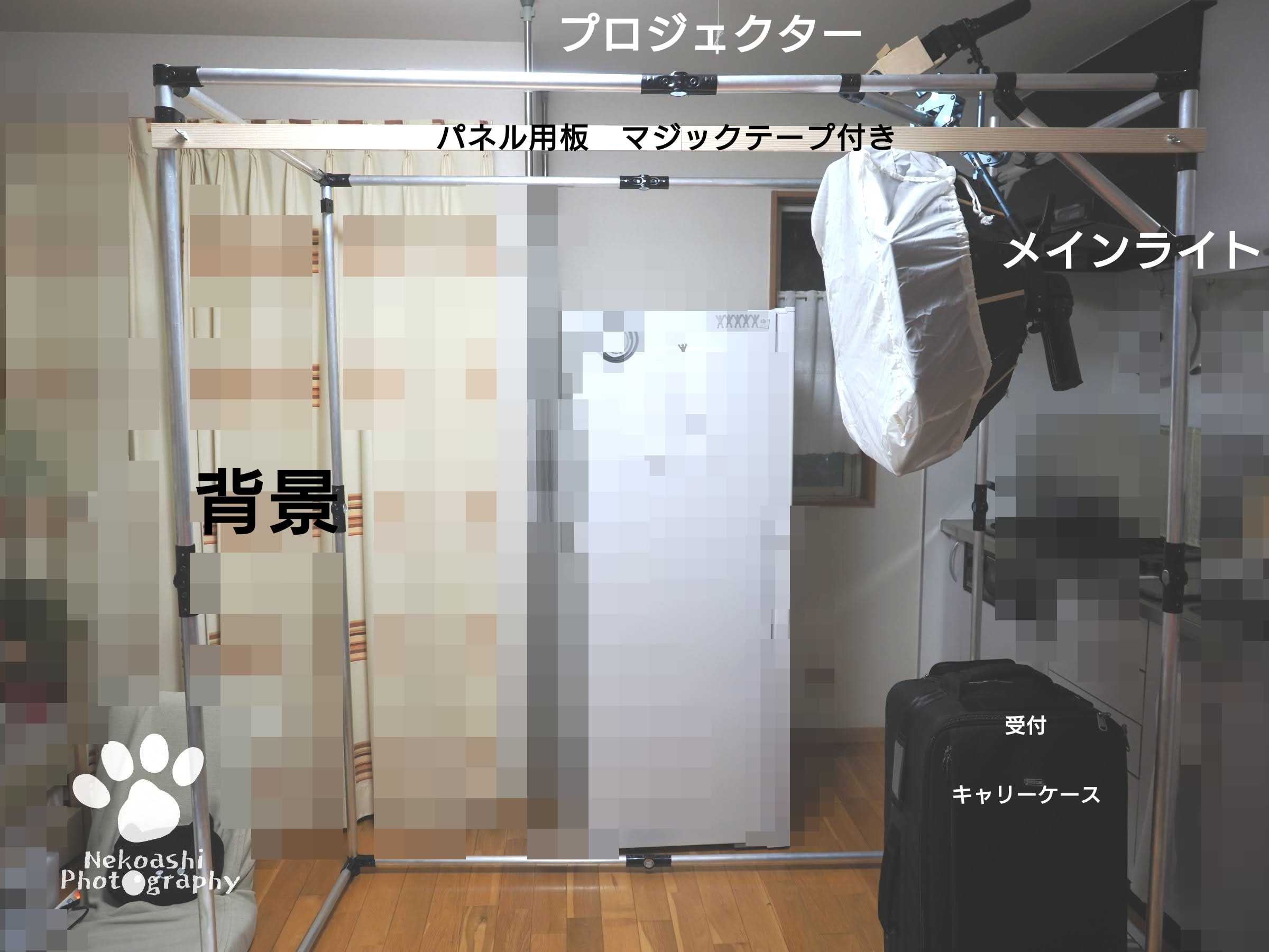 ようやくパイプとジョイントが全て揃いました!結局しっかりと囲う設計になりました。強度が全く足りませんでした。これに背景と背面部分に黒い布をぴっちりと張ります。上部は開けないと行けないのでコレでよくて向かって右側面はオープンにしてパネルを貼り付けます。キャリーケースには台置けるようにします。今考えたのですが、キャリーケースのハンドルを引き出してそこにテープでL時にしたパネルを貼れば充分なテーブルになるのでそれでOKにします。キャリーケースの横に椅子を置けば撮影中も売子さんの居場所が出来る。背景用の布を用意!後はパネル用に用意したマジックテープ。コレで後は椅子だけ用意すれば大丈夫。簡易的に布を張ってみた!被写体はメンダコさんでコレで撮影するとこんな感じになります。背景布を変えてみた。そしてスライド柄と背景布を変えるとこのような感じに!プロジェクターのピントが違うだけでこんなにも雰囲気が変わります。取り敢えずブース作りのフレームはコレで完成!後は装飾の写真と看板を作ればいいかな。思ったよりも何もかも大掛かりになってしまってます。撮影体験出来たらいいな!がガチ撮影ブースの制作となってしまいました。まぁコレも私らしいと言うかなんというか😅ブース自体の完成は来週になりますがここまで出来たので後は撮影したデータを渡す方法をまとめ上げます。頑張ります!