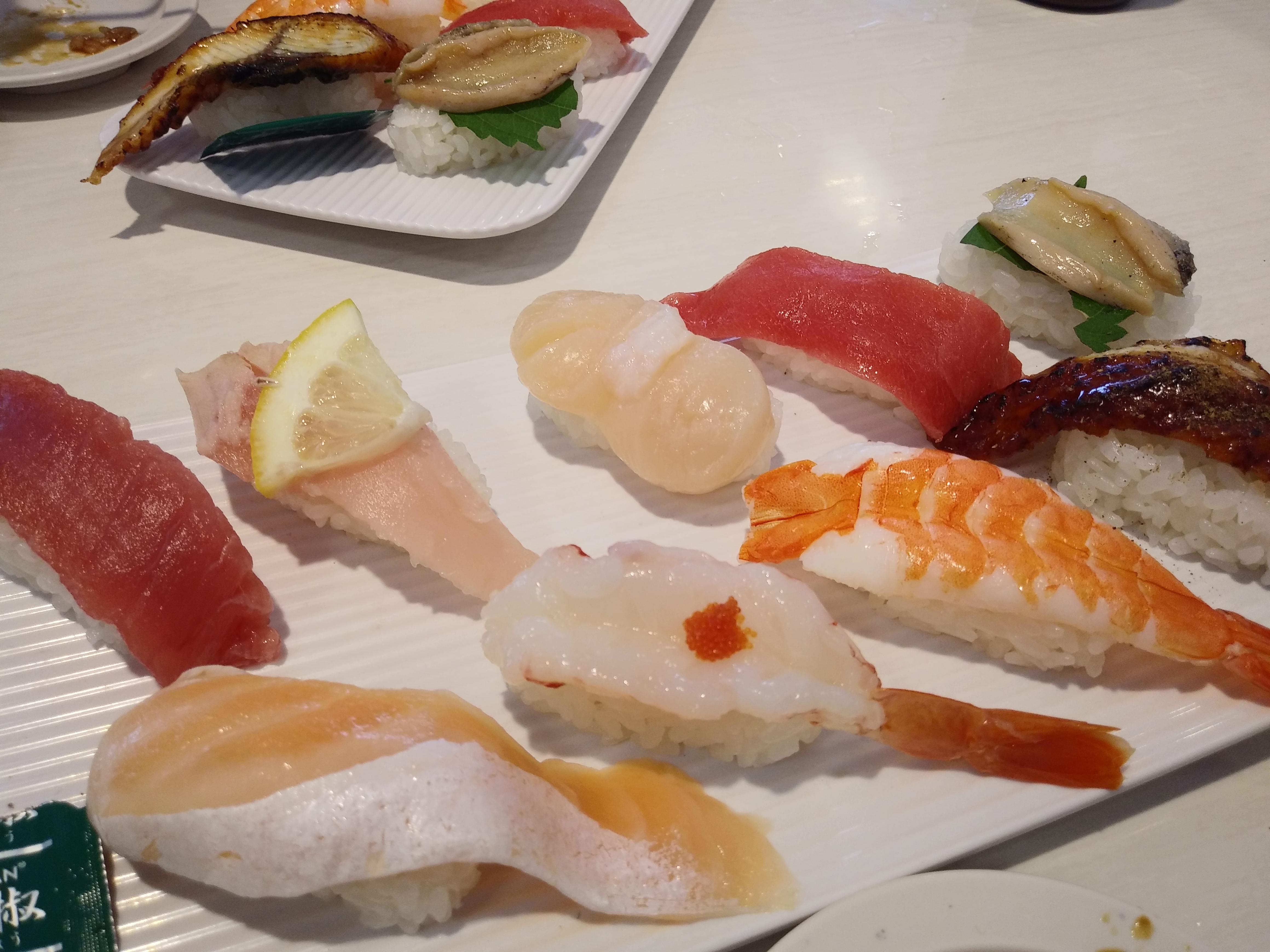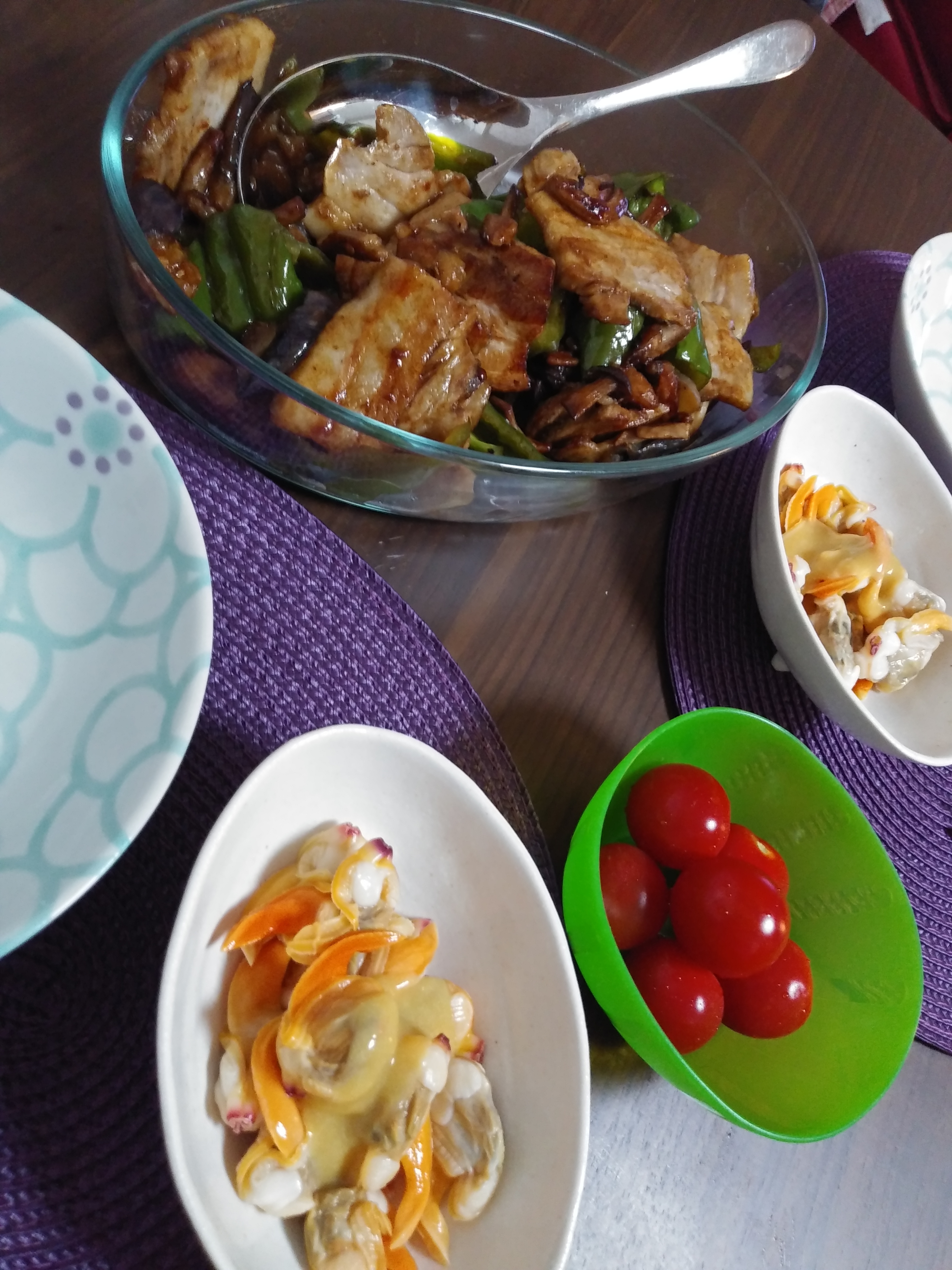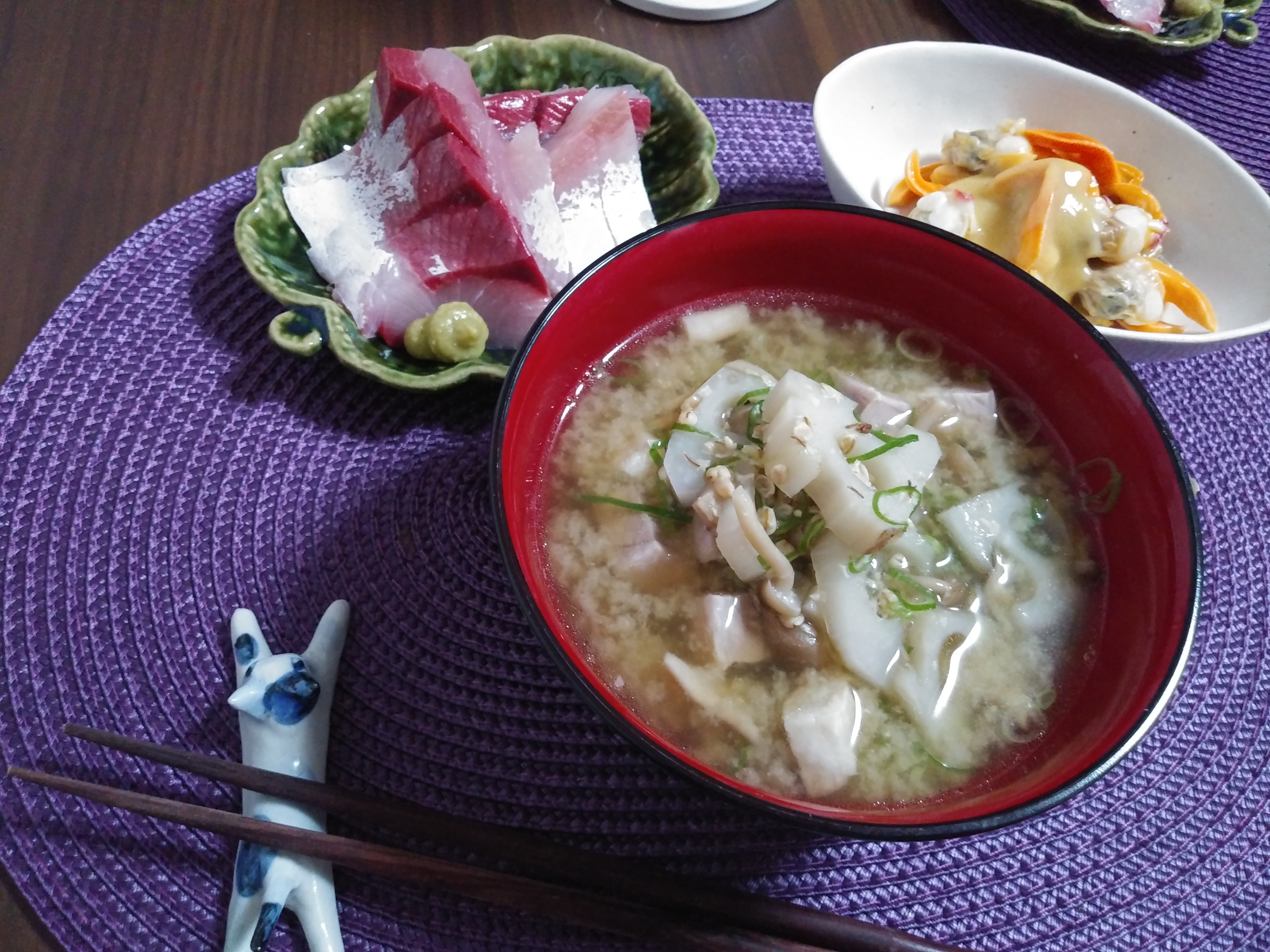 レンコンとしめじの豚汁、お刺身、貝の酢味噌和え