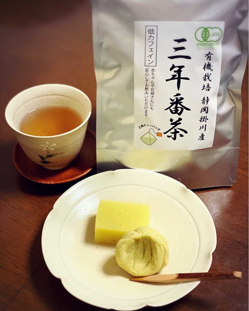 こんばんは🌆にゃももんです☺️ 今日は勤め先の大先輩が手作りされた栗きんとんと芋羊羹をいただきました💖 一緒に飲んだお茶は以前から紹介している三年番茶です💖ほうじ茶のようなとっても良い香りのお茶なんです❗️体に良く心も癒される贅沢な時間でした💕 いい香り❗️癒されるお茶✨✨