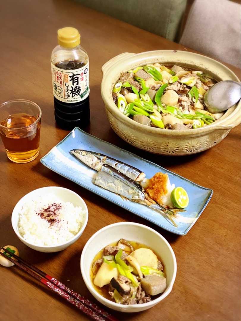 こんばんは😍にゃももんです✨✨ 今日の晩ご飯は芋煮と秋刀魚の塩焼きです❗️ オーガニックは里芋とこんにゃくとネギと醤油です❗️ こちらの有機醤油を気に入っております😘 キッコーマン 特選有機しょうゆ(750ml)【イチオシ】【org_4_more】【キッコーマン】[醤油]