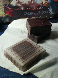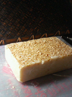 UPするときは一気ですナッツ系のせっけんは洗い心地がスバラシイと聞き及んでいたのでついに決行オイルはココナツ・へーゼルナッツ・アーモンド・ウォルナッツ・パーム・キャスターあれ、「ナッツ」以外のものまで・・・パームヤシもトウゴマも似ているはずオプションにオートミール大きな塊はケーキのよう?切り分けたらこんな感じ。ちょっと柔らかいうちに切っちゃったから断面が美しくないけど…作ってるときはナッツのいい香りがしたけど乾燥したらおおむねオートミールの香り・・・残念。泡立ちは良好。軽い泡図らずもオートミールの凸凹が泡立ちやすくしてるみたい感触はナッツのイメージとは裏腹に(?)さっぱり系。