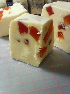 ドライフルーツを入れちゃいましたオイルはオリーブ・セサミ・パームシンプルです。オプションはパパイヤのドライフルーツ。香りはEOでメイチャン・フランキンセンスを1対1。パパイヤの効果とか香りとか、さっぱりだけどなんといっても見た目がかわいい透明感があって、透明石けんのモザイクみたい。使っていると少しずつ溶けていくのでボロッと取れることはありませーん。組成の50%をオリーブにしたので水での泡立ちはイマイチ。お湯+ネットならきになりません。乾燥中に出たソーダ灰(悲しい…)も使ったら消えちゃったのでたまにはキューブカットもいいですね