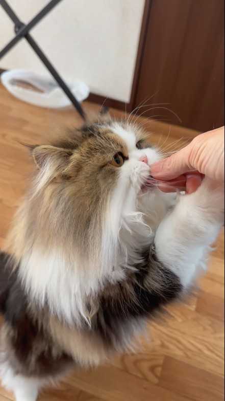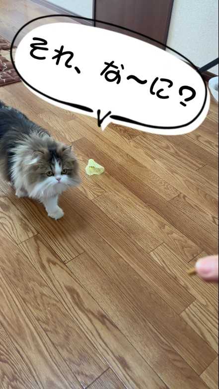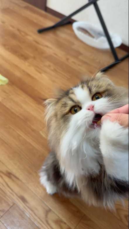 「それ、な〜に?」って顔で近づいてきて、あげたら、もうパクパク!小さな前足でしっかり握って食べよるけん、もう可愛か〜🥰