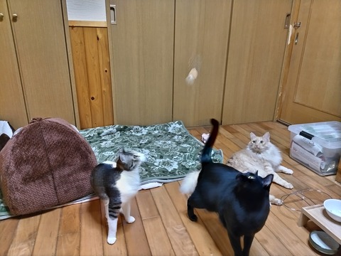 おもちゃを使って猫を釣る「猫釣り」さらに猫をジャンプさせる「猫飛ばし」勝手にそう呼んでいるんですが、私の得意とするところです。獲物(おもちゃ)を捕らえようとジャンプする姿は、猫の魅力的な行動のひとつ。今日は、そんな「猫飛ばし」の場面をお届けしたいと思います。使用するおもちゃは、前回紹介させていただきました自作・釣り竿式のねこじゃらし(ねずみ)です。↓↓https://plaza.rakuten.co.jp/nyantaro0924/diary/202301200000/動画で撮れば楽なんですが、そこはあえてハードルの高いカメラでの撮影に(ΦωΦ)ひとりで釣り竿片手に、スマホで撮影している私のおバカな姿を想像しながら・・・ご覧ください(ΦωΦ)猫群の中へ釣り糸を垂らしていきます↓↓気を惹きつけるためしばらくは地面で泳がせます↓↓複雑な動きをさせつつも魚と違って食わせ過ぎないように・・・さすがにブレますねm(__)mそろそろスイッチが入って来た頃まずは、オリーブから↓↓ネズミを宙に浮かせつつ進行方向から逆方向へ反動をつけ弧を描くようにスピードをつけて動かすと・・・身体を捻りながらジャ~ンプッ!猫の呼吸と動きを見ながら・・・タイミングよくネズミを動かすと↓↓今度はさらに高く身体を伸ばしながらのジャンプッ!見切れちゃいました(^-^;続いては、一番身体能力の高い我が家のエース・クロちゃんちょっと高めに設定してあげ同じように動かすと・・・・見事な>の字ジャンプww捻りなしのバージョンも↓↓ぴょ--------ん「猫飛ばし」いかがだったでしょうか?私のちょうど胸の位置ぐらいまで到達するジャンプ約1m30~50ほどの高さです。猫は自分の体高の約5倍の高さまで、ジャンプすることができるといわれているので驚きです。これも猫の野生的な狩猟本能の名残。キャットタワー、キャットウォールなどを設置することによってもジャンプしたり適度な運動につながりますが家の中での生活環境だけでは、次第に猫の野性的な狩猟本能は衰えていくように思います。猫たちにとっては、そのことで特別困ることはないし別に悪いことではありません。ここからは、私の経験と持論なんですが・・・様々な犬種のいる犬の場合、それぞれの犬種が本来持っている特性などを理解することとその特性を伸ばすような育て方は、長生きの秘訣にも繋がっていきます。猫の場合だと、より野性的な子の方がやはり長生きしていたように思います。それだけが要因ではないけど、今まで暮らしてきた愛犬、猫たちの事を思い返すとそう感じます。高齢になるにつれて、いつかはジャンプ力も体力と共に衰えてきますができるだけ愛猫たちには野性的な本能を持っていてもらいたい。猫本来の狩猟本能を刺激してあげる「猫飛ばし」自分の腕を磨きつつ、猫たちの身体能力も磨いていきたいものです。こちらはリリー↓↓リリーは、ちょっとおデブちゃんなのもあって猫飛ばしでのジャンプはあまり期待できません。が、しっかり地面で遊ばせてあげます(^^)右手奥にいる一番若いレオは寝とるしっ(ΦωΦ)やる気なしw今回紹介したオリーブとクロちゃんは、どちらも女の子うちの男ども頑張れ!動物好きな方におすすめしたい自作のどうぶつ年表の紹介良かったらご覧になって下さい↓↓https://plaza.rakuten.co.jp/nyantaro0924/diary/202209280000/夫婦を猫化した漫画の登場キャラです↓おバカ夫婦の日常から猫たちとの日常まで良かったらご覧になって下さい。今日も貴重なお時間、最後までご覧いただきありがとうございます。人間にも動物にも優しい商品を紹介しています。興味のある方は、画像をクリック是非ご覧ください。↓↓テレワーク現場のストレスと5G時代に対応した電磁波対策防御グッズ「電磁番AZ」(denjiban-1301)の紹介「天魔王信長の野望を打ち砕く 我が武略に勝算あり」ノンフィクション¥880「戦国日本人奴隷貿易の真相とキリシタン弾圧の背景」ノンフィクション¥1280「治療家・セラピストのための生体経絡・生気論」¥980「時代小説短編集・憑依(つく)」ミステリアスな題材による時代小説¥280「徐福渡来伝説を検証する」太古の日本に渡来した徐福とは何者か?古代史ドキュメント¥400謎解き奇々怪々「歴史探偵団㊙情報」五十三話¥820「おいしいりょうりをつくろう」電子絵本シリーズ¥280「こわいおばけがでたぞ!」電子絵本シリーズ¥300「とおせんぼ」電子絵本シリーズ・ぬりえができる¥280