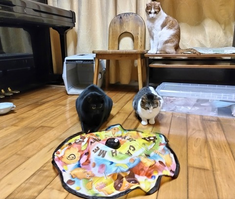キャッチ・ミー・イフ・ユー・キャン猫用電動おもちゃで遊ぶ、うちの若い衆たちです。初級猫から上級猫コースまで種類豊富な動きをするこの電動猫じゃらしは、ネーミングセンスといい大人気商品なのも頷けます(^^)猫用おもちゃは、いまや色んな種類のものがありますよね。価格帯も100均で買える安い物から、高額のものまで様々。猫の性格・好み、年齢によっても、どのタイプのおもちゃに食いつきが良いのかバラバラです。長い愛猫との暮らしの中で、今まで色んなタイプのものを買っては失敗と成功を繰り返しながら遊ばせてきました。現在所有している猫用おもちゃも貯まりに貯まり行き多数。あくまでも、うちの10匹と今まで出会ってきた猫たちの統計ですが・・・今日は私が使用している中から、コスパが良い・若い子から高齢の子まで共通して遊んでくれるという縛りで、精鋭おもちゃ3点の紹介。キャッチ・ミー・イフ・ユーキャンのような据え置き型の電動系おもちゃも良いんですが猫が自分で遊んでくれるものではなく、飼い主さんが手動で遊ばせてあげるものを推したいことについてもまとめていきたいと思います。①LEDレーザーポインターネットなんかではワンコインで買えるペンライト。猫の食いつきに関しては1番です。光源は赤色ですが、ライトのような照射された光に関しては色として認識してなくとも興味を示すようです。10匹中9匹(ヤング世代5、シニア世代4)が追いかけて遊んでくれます。ただ実態がないのが難点。獲物を捕らえるという達成感が得られないので遊ばせ過ぎ、レーザーの過度の動かし過ぎは、逆にストレスになる可能性が高いです。使い方としては、高齢の子などの運動不足のために短い時間軽めに遊ばせています。じ~・・・・べしっ!➁釣り竿式猫じゃらし(ネズミ)ワンコインでお釣りがくるお値段。ホームセンターなんかでも売られている、ネズミにはウサギの天然毛を使用した釣り竿タイプの猫じゃらし。ウサギ毛が猫の狩猟本能を掻き立てるようで、うちのどの猫にも人気です。こちらは実態有りなので、最後に捕まえさせることができ一連の狩猟行動と運動不足・ストレス解消にもつながります。 難点をあげるとしたら・・・紐が絡まりやすく、複雑な動きをさせづらいこと。ネズミがややデカいらしく、高齢の子たちにはスルーされることがあります(;^ω^)どんな猫でもおもちゃを使って猫飛び(ジャンプ)させるてあげることが得意なんですが(自称)ダイソー商品など低コストで改良版の類似品を自分流に作って使用しています。難点を改善したものがこちら↓↓後日、作り方は簡単なので紹介したいと思います。今年で15才になるミント、今でもしっかり遊んでくれています(^^)③ボール(紙)広告チラシや新聞紙を小さく丸めただけ。実質0円、コスパ最強ですwもう色んな猫おもちゃを経験してきて一周回ってここに辿り着くという・・・ただ意外とこれは侮れません。うちでは、若い子はもちろん最年長の子も紙ボールが大好き。幅広い世代で遊んでくれます。猫が大好きなカサカサという音もするし、大きさも調節可能。16才になる、にゃん太郎の遊び方の一部ですが・・・!?練り練り近づき・・・ベシっ!と勢いよく!?戸棚にボールを投げたり置いては、キャッチもしくは猫パンチで落とすを繰り返してくれます。また、にゃん太郎だけでなく他の子たちも、1度紙ボールをカサカサと音を立ててから遠くに投げると勢いよく走って追いかけて遊びます。この子は、これが一番のお気に入りというおもちゃもありますが以上の3選は、幅広くみんなが遊んでくれるものです。最後に、据え置きタイプでなく手動で遊ばせてあげる猫用おもちゃの方がより良いと思う理由とメリット・その活用法について綴りたいと思います。中々遊ばせてあげる時間がないという飼い主さんもいらっしゃると思いますが愛猫との距離を縮める上でも、猫用おもちゃを実際に手にとって短時間でも遊ばせてあげることほど近道はないと思います。遊ばせてあげている中で、今まで気付かなかったその子の性格・特徴、好みまで新たな発見も出てきます。また多頭飼いをしている私の場合、それぞれの子の体調の変化にすぐに気づいてあげる必要があります。普段の遊んでいる姿と比較してみて、体調チェックや異変がないかの目安のひとつになるので自宅にいるブリティッシュ2匹、毎日様子を見に行っている8匹の子たちとは短い時間でも遊ばせてあげることを心がけています。そして、これは実体験に基づいてですが万が一、家からそう遠くない近辺に脱走してしまった場合。お気に入りのおもちゃを持っておくことが、捕獲する上でかなり効果的に働きます。室内猫の中には、外に誤って出てしまうと興奮状態にってしまい飼い主さんが近づこうとすると逃げたり、攻撃的になる子がいます。そのときに大好きなおもちゃのカサカサという音や普段遊ばせるように見せてあげるとフッと我に返っ