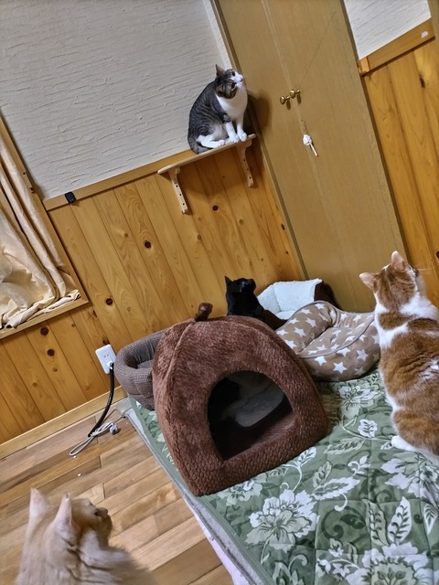 新年を迎え、早いもので1週間が過ぎようとしています。 なんだかすごいあっという間に感じます(;^ω^)犬や猫たちの成長スピード・年の重ね方は、人間に比べても圧倒的に速いです。このあっという間の1週間・・・うちの愛猫たちそれぞれにとっては、どういう風に感じているんだろう?野良猫から保護した経緯の子がほとんどなので、正確な誕生日はありませんがうちの10匹の猫たちのそれぞれの年齢に「1」が加わる重みを噛みしめながら今日は、新年を迎えた猫様たちのご様子をお届けしたいと思います。まずはブリティッシュショートヘアのボニー(♂)とリリィ(♀)。同じ猫種なだけあってか?新年から中々のシンクロ率です。この二人は漫画にも登場していますので良かったらこちらをご覧ください。↓↓https://plaza.rakuten.co.jp/nyantaro0924/diary/202212080000/https://plaza.rakuten.co.jp/nyantaro0924/diary/202212090000/続いて保護猫たちの住む、すぐそばの実家へと足を運んでみます。ん?いつも集っているお座敷に誰もいない。乱れた電気カーペットに怪しき膨らみ・・・私にとっては容易過ぎるかくれんぼ。誰がいるのかはお見通しです(^^カーペットを少しめくると・・・どんな重い敷物にも頭突きをしながら潜っていけるのが得意最年長ボス・にゃん太郎(♂)と・・・さらにその奥にはその子分のラム(♂)。構図としては、まずにゃん太郎が頭突きをかましながらトンネルを作ったところを身体の小さなラムもここぞとばかりに中に入る。熱くなってきて、にゃん太郎は淵へ・・・といったところでしょう。続いて二階踊り場には・・・ゆず太郎(♂)。裏ボスなだけあり、日中は来客・不審な動きがないか誰よりも速くスタートダッシュできるように一階と外を眺めれる絶妙な位置でおくつろぎ中。その横、家の中で一番日当たりの良い場所には・・・ミント(♀)が日光浴中。適度に陽を浴びることは人も猫にとっても大事ですね。ここまでがシニアグループ。こちらにそれぞれの子を保護するまでの経緯の物語を紹介していますので時間のある方は、ご覧になってください。にゃん太郎とミント↓https://plaza.rakuten.co.jp/nyantaro0924/diary/202209150000/ラムとゆず↓https://plaza.rakuten.co.jp/nyantaro0924/diary/202209160000/さてまだまだ行きます。ヤング・アダルトグループ。階段付近には・・・一番若いオリーブ(♀)とレオ(♂)。同じ年齢とその若さだけあってシニア猫たちが活動停止中も一番動きのあるふたりです。オリーブ、レオはこちら↓https://plaza.rakuten.co.jp/nyantaro0924/diary/202209190000/最後は・・・姉弟のくろ蜜(♀)とリリー(♂)。仔猫のとき瀕死状態だったこのふたり。血縁関係、同じ境遇を乗り越えてきたこともあり、とにかく仲が良いです。ベッドの原型がこちらなので↓潰れるほど折り重なり合わんでも(^-^;くろとリリーの物語はこちら↓https://plaza.rakuten.co.jp/nyantaro0924/diary/202209170000/長くなってしまいましたがここまでが新年明けての初出し10匹の猫たちの様子になります。冒頭でも触れましたがこの子たちにとっての1年間となると・・・私が感じるものよりも、さらにさらに長いものになることでしょう。病気を抱えた子もいれば・・・高齢の子も多くいます。どんなことがこの子たちに待ち受けているのか不安や心配はありますが今年1年、まずは健康で過ごしてくれますように。1日1日、一緒に過ごせることを大切に見守っていければと思います。夫婦を猫化した漫画の登場キャラです↓おバカ夫婦の日常から猫たちとの日常まで良かったらご覧になって下さい。今日も貴重なお時間、最後までご覧いただきありがとうございます。人間にも動物にも優しい商品を紹介しています。興味のある方は、画像をクリック是非ご覧ください。↓↓カネマサ健康通販テレワーク現場のストレスと5G時代に対応した電磁波対策防御グッズ「電磁番AZ」(denjiban-1301)の紹介「天魔王信長の野望を打ち砕く 我が武略に勝算あり」ノンフィクション「戦国日本人奴隷貿易の真相とキリシタン弾圧の背景」ノンフィクション「治療家・セラピストのための生体経絡・生気論」 「時代小説短編集・憑依(つく)」ミステリアスな題材による時代小説 「徐福渡来伝説を検証する」太古の日本に渡来した徐福とは何者か?古代史ドキュメント「歴史探偵団㊙情報」五十三話「おいしいりょうりをつくろう」電子絵本シリーズ「こわいおばけがでたぞ!」電子絵本シリーズ「とおせんぼ」電子絵本シリーズ・ぬりえができる
