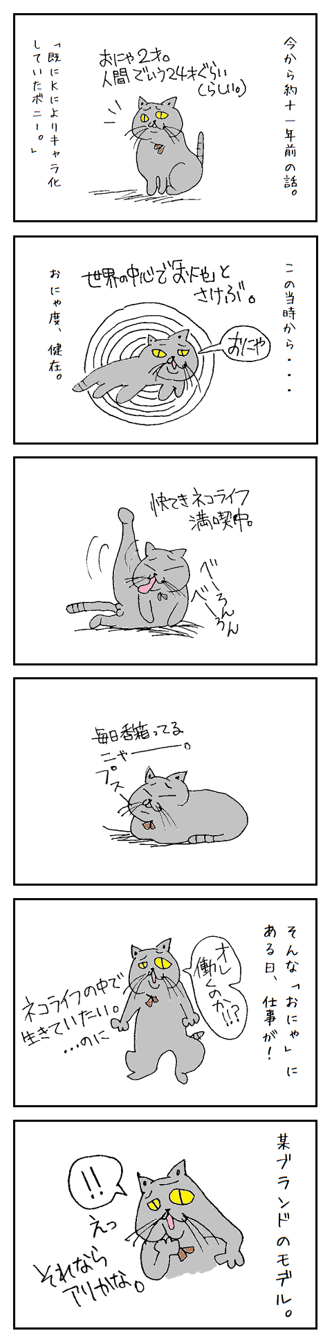 昨日は『猫の日』でしたね(ΦωΦ)1日遅れちゃいましたが...『猫の日』にちなんでうちの愛猫「ボニー」の輝しき事績親バカTKから「おにゃ伝記」をひとつお届けしたい思います*:--☆--:*:--☆--:まずは、こちらの漫画から↓↓※漫画は、約11年前にKが描いていたものをなるべく当時のままで掲載してます(一部修正)。年季入りまくってるので悪しからず。【某ブランドのモデル】これだけではなんのこっちゃ分かりませんよね(^^;)詳細をお伝えする前に、お手数ですがこちらのキーワード二つ、おさえてもらえると<(_ _)>【補足事項にて】※【猫ぐらし】猫好きの方ならご存知の方も多いあらゆる猫情報を網羅、今や幻となってしまった季刊・猫雑誌(アスペクト出版)→現在は事実上の廃刊。※【MINT Neko】(デザイナーNINT氏ランド。ノートの端の落書きから生まれたネコは増殖し続け、今や200匹を越える。家系図の中で繰り広げられる物語をファッションというフィルターを通して表現し、キャラクターでありながらファッションであるという唯一な存在は様々なアーティストに支持され、その世界観を広げている。MINT Neko公式HPより引用MINT Neko家系図の一部(K私物雑誌より)キャラクターたちはこんな感じでたくさん。この子たちのキャラTであったり...こういったジャケットや小物に至るまで豊富なアイテムを展開しているブランド※愛用著名人:ゴールデンボンバー(歌広場 淳氏)...etc以上をおさえてもらったところで...━─━─━─━─━─━─━─━─━─━─当時(2014)、MINT Nekoファッションにがっつり身を包んでいた若かりしKさん。愛読していた「猫ぐらし」の中で【MINT Neko】×【猫ぐらし】コラボ企画「MINT Neko公式キャラクター」に目がとまります。~企画内容~企画に応募した読者さんの愛猫(プロフ&写真)からMINTさんが厳正なる審査の上、選考。見事当選した愛猫は、新キャラクターとしてMINT Neko公式キャラクターの仲間入り!というわけです。この機を逃さない訳にはいかない。ただ、応募はおそらく殺到するのが予想される。ブランドのファンの方(恐らく愛猫家さん)、猫ぐらしの愛読者(間違いなくガチ愛猫家さん)がうちのニャンコを~!と集まるであろうから。。━─━─━─━─━─━─━─━─━─━─【企画応募】ダメもとで...ボニー激写→プロフ写真郵送当選者は次号にて発表される。。発表を待つまでの間...ボニー当選を確固たるものとして妄想するK。。「だって...こんなに個性の塊のような猫はそうそうおらんやろ(親バカ)」ここからは、当時のKのひとり言落書き。。ただ・・・ブリティッシュショートヘアはイギリス猫、大穴でユニオンジャックおにゃだったら素晴らしき(-ω-)傾向と対策...MINT Nekoを愛用/デザインを熟知するKはある程度の予想をしていたのです。...当選するかも分からないのに━─━─━─━─━─━─━─━─━─━─【当選者発表】こちら現物、大事に保管してました(当選者発表2014年冬号)もう、結果がどうだったかは・・・分かります...よね(*´ω`*)分かってはいてもやっぱりドキドキするwでは、当選者の発表*・゜゚・*:.。..。.:*・゜⇩⇩⇩⇩どぅるるるるるるる⇩⇩⇩⇩るるるるるるるるる~⇩⇩⇩⇩だだんっ!※ねこプライバシーに配慮し一部モザイク加工見事、当選猫3匹の中に選ばれました.。゚+.(・∀・)゚+.゚ではでは、アップでどぞ(ΦωΦ)」ボニーの若いこと、若いこと(笑)性格...負けず嫌い。。って(笑)まぁ確かに否定はできん(。-`ω-)MINTさんによりキャラ化した「ボニーボニーボン(本名)」がこちら⇩⇩なぜか胸毛ふさふさ(笑)どうでしょう?Kの予想的中...ではないでしょうかw「おにゃ度」が失われた感は否めませんでしたが当時、めちゃくちゃ嬉しかったのを今でも思い出します♫MINT Neko公式キャラクターの仲間入り選ばれた猫キャラたちはコラボキャラTシャツとして限定発売!こうして、ボニー(当時2歳)はブランドのモデルとしてお仕事をするのでした*・゜゚・*:.。..。.:*・゜当選者には副賞として1着プレゼント「うちの子の初仕事なんですのほぉぉお~」発売と同時に購入しまくって家族や友人に配り回っていたなぁヾ(´ω`=´ω`)ノTKそれぞれ1着ずつ、大切に保管していますおにゃの思い出と共に*・゜゚・*:.。..。.:*・゜【エピソードおにゃ】また、どこかで<(_ _)>☆バレンタイン&猫の日企画☆TOWAにSALE終了いたしました。ご来店誠にありがとうございました(^-^)漫画のオリジナルTKグッズBASE店はコチラから↓↓ 漫画のオリジナルTKグッズminne店はコチラから↓↓ TKworld~ねこのハンドメイドグッズ専門店~今日も貴重なお時間最後までご覧いただきありがとうございます。カネマサ/BASE店へはコチラから自社で製造/販売している商品を紹介しています。国内では取り上げられることの少ない深刻な電磁波被害。興味のある方は、是非ご覧くださいませ⇩⇩当ホームページへテレワーク現場のストレスと5G時代に対応電磁波対策防御グッズ「電磁番AZ」(denjiban-1301)の紹介