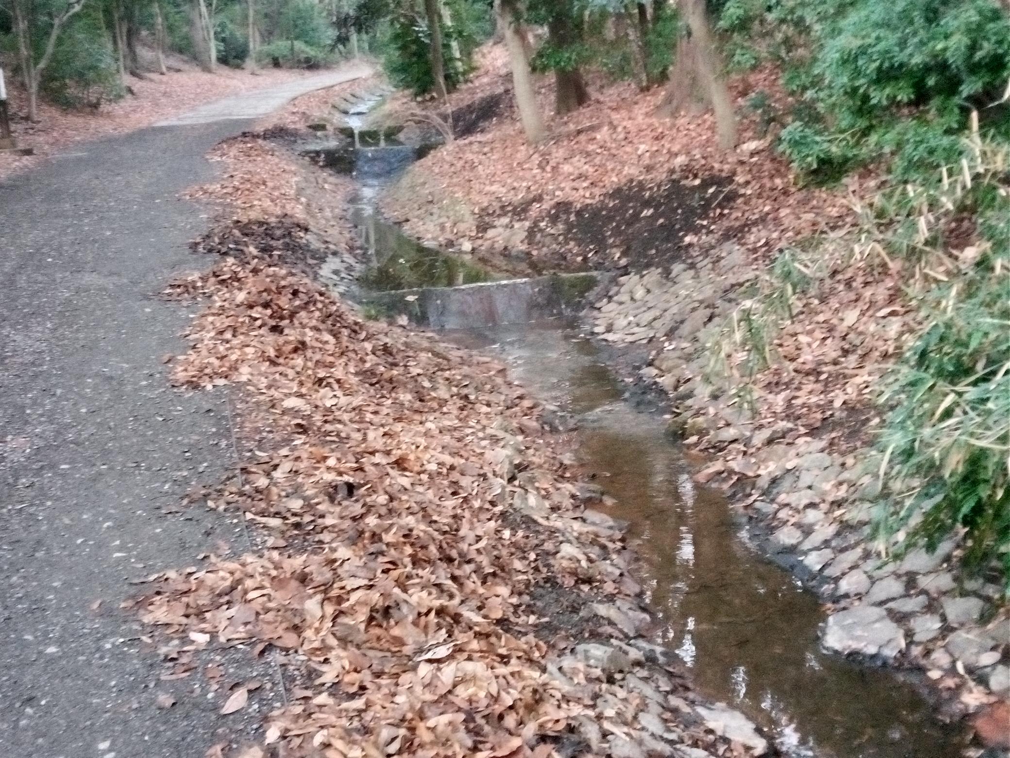 緑道沿いに流れる小川に落ちた落ち葉を攫って水の流を良くしていました。びっくり