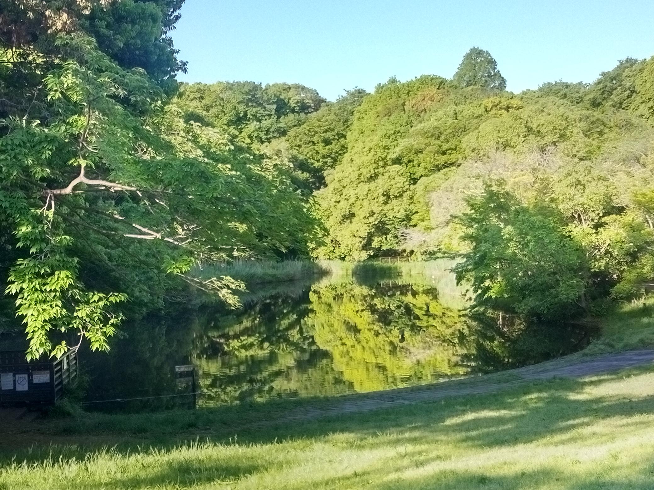 ​鴨池公園の池は「水鏡」で湖面に森が映っていました。