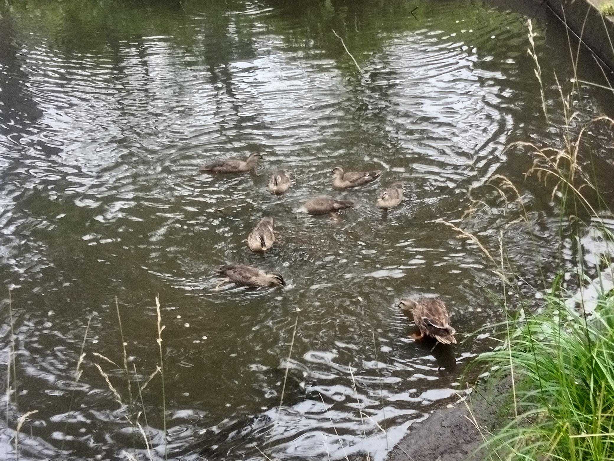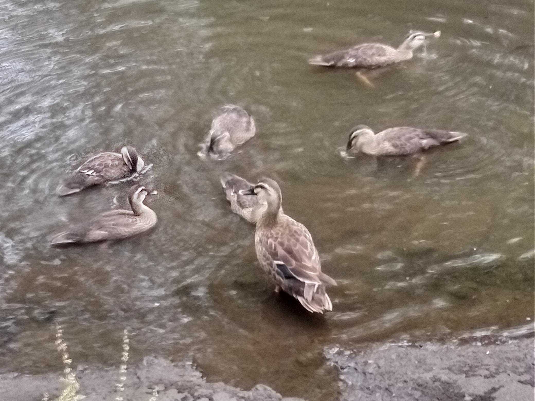 ​この朝は大人鴨6羽、小鴨11羽にエサをあげました。ウィンク