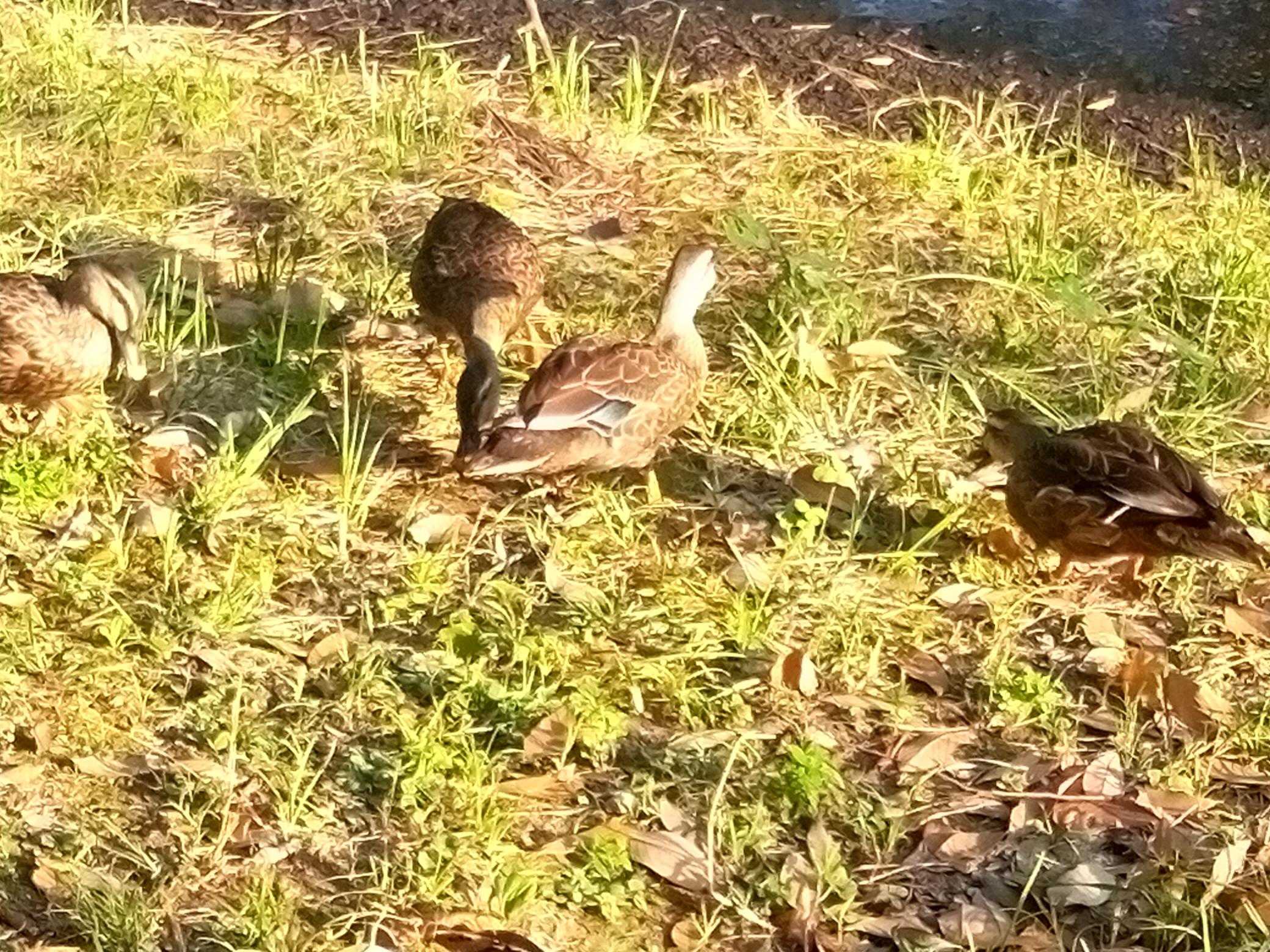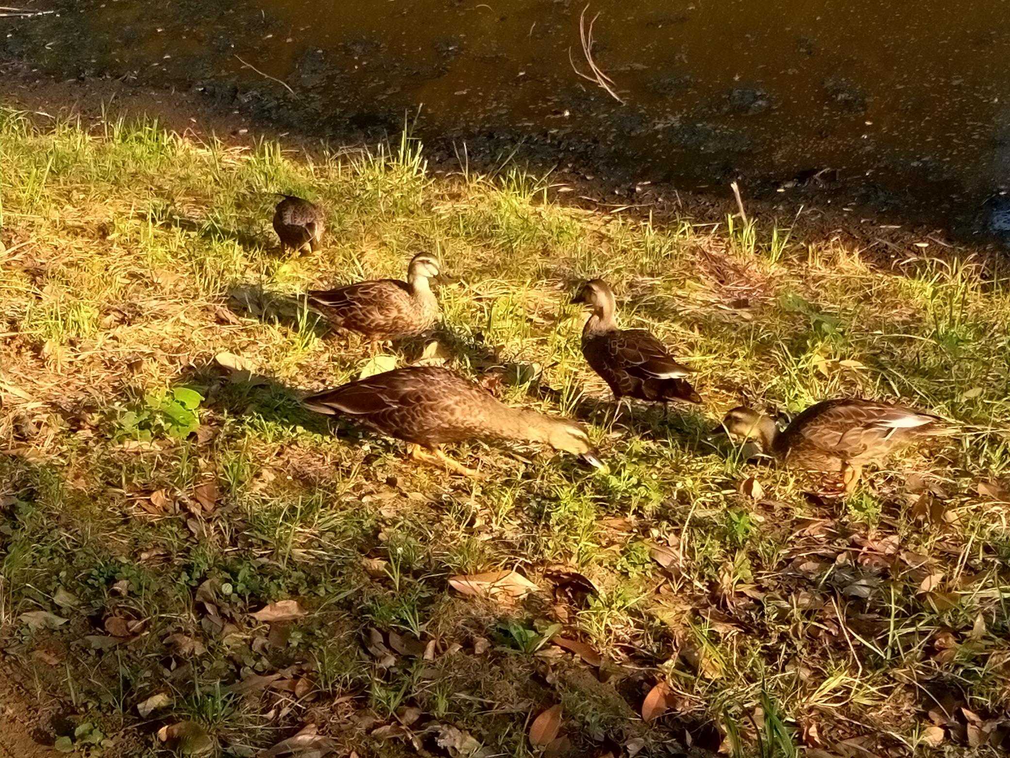 妻がエサをあげると5羽の鴨が陸に上がって来ました。