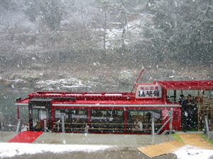 ちょっと遅いお正月帰省をしてきました!京都に3泊。ちょうど雪が降ってものすごーく寒い日に当たってしまいました。京都に着くなり、「今日はみんなで食事をしてそのままそこに泊まってもらうからね!」えっ????どこに泊まるの?言われるがまま付いていくと嵐山に到着。渡月橋のふもと辺りから専用船に乗っておよそ10分桂川を上がっていきます。うわ~なんかわくわくしてきた♪ちょっと人里離れた山の中にお宿が・・・『嵐峡館』に到着。創業108年の老舗旅館だそう・・・情緒たっぷりで静かなとっても素敵な旅館です。いつもならお部屋からトロッコ列車や保津川下りの船も見られるとか。でも雪の舞う景色もまた格別!料理も最高。。本当に美味しくてやっぱり京料理はいいな~と感動しきりでした。温泉も出ていて、静かにゆったり過ごすには最高の旅館ですね。翌日は嵐山近辺をせっかくだからと久しぶりに散策することに。そしてせっかくだからと!おのぼりさんのように人力車にも乗っちゃいました♪お兄さんすっごくいい人!いっぱい説明してくれて写真もたくさん撮ってくれて時間も延長してくれて・・・大満足!お兄さん、ありがとう^^また紅葉の時期に乗りたいな。しかし、、、人力車、初めて乗ったけど、結構な料金とりますねー(>_