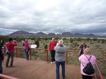 15:50からカタジュタ・ウルルサンセットツアーに出かけました。本当は昨日参加の予定でしたが、あいにくの雨だったので一日延期してもらいました。果たしてサンセットがうまく見れるか、その時間にならないとわからないままホテルを出発しました。平年だとこの時期は最高気温が35度から40度を超えることもあるとのことでしたが今日は全く逆で、少し寒いくらいです念のため日本から持ってきた、フリース、ヒートテックタートル、ウィンドウブレーカー、ジャンバーがこれほど矢に立つとは思っていませんでした。ホテルから車で、カタジュタ(36個の奇岩群)を見に行きました。途中の展望台からは、ウルル(エアーズロックのこと)とカタジュタの岩岩が一度に見ることができます。(↑カタジュタに向かう途中の展望台から)さらに進んで、カタジュタの西の端にある4つの岩の麓でバスを降りて片道1.3キロメートル、大きな岩の間を縫って岩道を昇り進んでいきました。これだけ大きな岩の谷間を歩く機会はなかなかないと思います。このスケールの大きさは、残念ながら写真では伝わらないかもしれません。カタジュタ歩きが終わると、いよいよコンドはウルル(エアーズロック)の日没を見にいきます。ここは、世界中から大勢の観光客がやってきて、シャンパン、ワインを片手に夕陽が落ちる時間を待ちます。今日の日没は19:15分と聞いています。あいにく昨日からの雨で、上空には厚い雲が覆いかぶさっていますがはるか西の空の下からは、うまくいくと地平線に沈む太陽がエアーズロックを照らすかも・・・・見学地点に着いた時は、岩には夕陽は差してなく・・・でも、このスケールの大きい岩を目の辺りにしてみんな感動している様子です。しばらく周囲の人と談笑しているうちに岩に明るい日差しが差し込んできました!!見る見るうちに岩が夕陽で照らされ写真で見ている以上に、ダイナミックな光景を映し出してくれています本当なら昨日来る予定でしたが、思い切って一日延ばして大正解!雨で寒く何も見えなかった昨日と比べ、格段と輝いているエアーズロックに、みんな感嘆の声を上げていました!(右上の写真がそれです、ほんの5分位だけ陽が差してこのような景色になりました)夕陽が輝きだすまでの間、隣の集団にいた一人の老人が話しかけてきました「どこから来たの?」「東京です、そちらは?」「私達はアメリカ、アリゾナから来ました」「アリゾナのスコッツデールには前に行きました! 4・5日宿泊して、ゴルフばかりやっていました!」と言ったらその老人は嬉しそうな顔をしてくれました。たまたま妻がボストンレッドソックスのウィンドウブレーカーを着ていたのを見て「ボストンには言ったことがあるの?」と聞かれ「昨年の5月に美術館とレッドソックスの試合を見に行きました!」と話したらこれもとても喜んでいました「私達は引退するまではボストンに近いところに長く住んでいて 大のレッドソックスファンなのです、こんなところでそのBのマークを見れるとは!」と喜んでくれました老人は75歳、「10年ほど前にリタイアして、今回の旅行はオーストラリアとニュージーランドを1ヶ月かけてゆっくりと旅する計画で、まだ始まったばかり、あと3週間残っている」と楽しそうに話してくれましたそして、「ところであなたの旅行はどれくらいの期間なの?」と聞かれ「実は1週間です、今の私にはなかなか1ヶ月の旅行には行かれないんです」と話したら「私も現役の頃は、2・3日の旅行がほとんどだったから当然だよ!」と同情の目で話してくれました日本の平均的なリタイア年齢は何歳か、そのあと多くの人はどうしているか興味深く聞いてきて、リタイア後の人生談義で盛り上がりました。行動的な老人の旅行の姿に、改めて豊かさと、好奇心の強さを見つけられ日本のツーリズムも徐々にこのようなスタイルになるのかな・・・?と感じさせられました。時間的な制約のある人は仕方ありませんが、彼らの旅行スケジュールをお聞きして日本の旅行会社の提供しているツアーが余りにも画一的なものばかりであることも痛感!もっともっとスケジュール的に「豊かな旅行」を提供していかなければならないことを再発見させてもらいました明日は4時起きで、コンドはエアーズロックの日の出ツアーに行きますきっとまたアリゾナの老人ご夫婦に会えることでしょう、楽しみです!