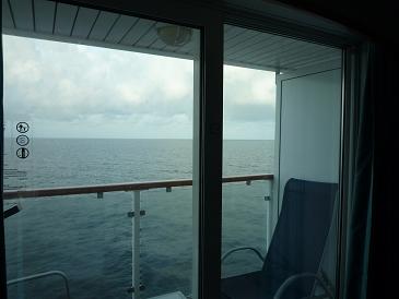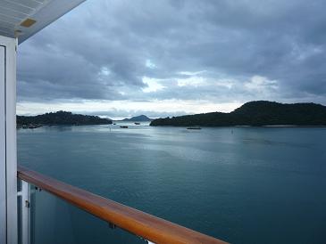 クルーズ3日目、朝目が覚めてべランダから外を見たら、もう船はプーケットの港に停まっていました昨夜ペナン港を出て、寝ている間にプーケットに着いたようですプーケットの空はどんよりと曇っていて、遠くは雨が降っているようです私達の部屋は進行方向左側の部屋で港に船が接岸した際に、どちら側に着くかで部屋からの景色が違って見えます船の反対側に行くとまったく違う景色のこともありますペナンのときは左側に接岸したのですがプーケットでは右側です今日はオプショナルツアーには参加せず自分たちで行動しようということにしました従って朝は少しゆっくりできて8時半に"Bella Vista"でAmerican Breakfastですところが・・・このAmerican Breakfastはとんでもないボリュームですジュース、パン、コーヒー、卵、ベーコン、野菜サラダ、ポテト、フルーツとこれだけで十分なのですが、なんとこれに朝からステーキと温野菜が付きますパン、フルーツ、サラダはブッフェですからいくらでも食べられますにもかかわらず、ステーキまでとは・・・後でわかりましたが、お肉は頼まなくても良かったのでしたでも日本人によくある光景ですが、せっかく出されたものは捨てるのは失礼だ!ということでがんばりましたが完食は不可能なボリュームでしたオプショナルツアーに行く人たちはかなり早い時間から集合がかかり大勢の人が下船したのでなんとなく船の上は静かになりましたそんなことでいいチャンスなので船の中をゆっくりと見て回ることにしました最上階13階後方にはスポーツデッキがありますゴルフレンジ、パターゴルフ、それにバスケットコートやジョギングコース(ウォーキングももちろんOK)など赤いアンツーカーのようなラインを一蹴すると200mと書いてありました気持ちの良い空気を吸ってことで運動するのもなかなか楽しみですね12階に降りて前方にあるギャラクシーオブザスターズというエンターテイメントスペースがありますここからは船の最前部でまるでコックピットのようですここにはCaptain's Bridgeという螺旋階段で一つ下の階にある操縦室を後方から見ることができますこのときはプーケットに停泊中ですから、操縦席には誰もいませんがナビゲーションのディスプレイなど見ることができますこれだけ大きな客船のコックピット(ブリッジと呼ぶそうです)ですのでとてもスペースには余裕があります、うらやましい環境です12階はその後方にスパ、ジム、麻雀ルーム、図書室アクティビティセンターなどがつながっていますその後方がプールです左右にデッキチェアが並び真ん中に大きなプールがあります水温は少しぬるいくらいプールに入っているときはまったく寒くありませんが外に出て風に当たると寒く感じるかもしれません大型客船の目玉的な存在のプールですが今は寄港中ですのでひっそりとしています11階、10階、9階は客室になっていますまだまだ船の中にはいろんな施設がありますがそろそろ下船してプーケット観光をしますので・・