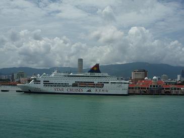 クルーズ2日目(ペナン)船は午後2時定刻通りペナンの港に着きましたここペナンの港には同じスタークルーズの船が接岸していましたペナン観光は予約していたスタークルーズのオプショナルツアーに参加しますおよそ4時間、さらっとペナンを観光しますペナンはマレーシアシンガポールから乗船したわれわれですのでペナン島に下りるのには出入国手続きがいるのですがあらかじめ全乗客のパスポートを船側が預かっていて入国手続きをしてくれていますだから乗客は例のアクセスカードで手続き確認をするだけで済みます便利なようですがちょっと気になります外国にいてパスポートを持っていないのですから・・・それだけにアクセスカードが重要になるということです下船後、バスがずらっと並んでいる一角に行き指定されたバスに乗りますバスには中国人、白人、インド人の姿が多くガイドの言葉は英語と中国語です一人のガイドが2ヶ国語で案内しますのでほとんどしゃべりっぱなしです世界遺産に登録されている寺院やショッピングのために何軒かお店に立ち寄りますいろいろな国の人たちが同じバスで観光をするというのもなかなか面白いものです日本人はわれわれ二人だけバスの座席は最初に座った場所のままこれで人数確認をしていますオプショナルツアーはプーケットの古い町並み「ジョージタウン」を中心に観光します目玉は「人力車」ジョージタウンの中を人力車で回るというものでなかなかユニークな試みですインド人街や、大きな通りで車がガンガン走っている中を人力車が右へ行ったり、左へ行ったりします一般の車から見るとノロノロと走る人力車は邪魔な存在なのでしょうが人力車に対するクラクションも無くここでは定番の乗り物になっているようですその後タイ寺院を見た後、地元のショッピングをしてツアーの最後はフローティングビレッジという水上生活者の村を見て船に戻るものです途中ホテルのレストランで軽食(Afternoon Teaと言っていましたが・・・)をとりましたこのオプショナルツアーの料金は一人80シンガポールドル(約5000円)およそ4時間軽食付きの料金ですマレーシアの古い街並みは、どこも似たような感じで今年の1月ジョホールバルに行った時と同じ感覚でしたクルーズとオプショナルツアーは切っても切り離せない関係のものです船旅の楽しさは船の中はもちろんですがこうして寄港地に下りて観光をするというのも楽しみの一つです宿泊はもちろん船の部屋ですので出かけたら港に帰るわけですが港を拠点にする生活というのは普段ではなかなか味わえないものです中には船に残り下船しない人もいるようですがほとんどの人は何らかの形で下船して寄航先を楽しんでいる様子でした港に戻り、スターバーゴを見たときは我が家に帰ってきたような懐かしさを感じただけでなく改めて船の大きさを感じさせられました(↑再乗船の手続き中)そして再び乗船の時にアクセスカードのチェックが一人ひとり行われます万が一乗り遅れたとしても、船は予定通り午後4時には出航してしまいますからこういうときは遅れる人はいないようです