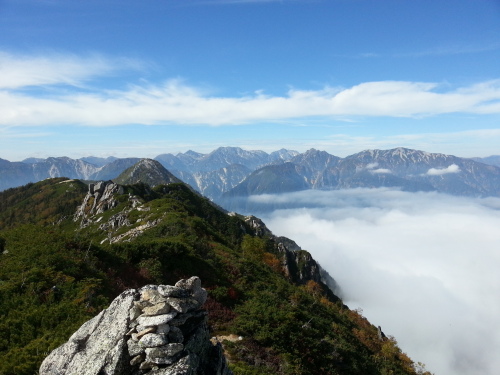 9月26日の朝5時30分過ぎに白沢登山口をスタート!天気は快晴予想! 白沢登山口より約2時間で魚止の滝に到着する!最後の水場 ここで水の補給!ここからは急登が続く!大凪山の頂上! 登山道の脇に標識だけ建っていました!餓鬼小屋に近付くと紅葉が見頃になっていました!白沢登山口から約8時間で餓鬼小屋に到着!餓鬼小屋から5分位で餓鬼岳(標高2647m)餓鬼小屋の夕食 おでんにひじきにかやくご飯! デザートはグレープフルーツ!9月27日 今日も天気は快晴!雲海の彼方には旭日に照らされる富士山が!餓鬼小屋からは東沢岳方面に向って岩稜帯を歩く!餓鬼小屋からアップダウンを繰り返し約4時間で東沢岳(標高2497m)!東沢岳からは中房温泉に向って下る!東沢の乗越(標高2253m)は古い標識だけの狭い鞍部!東沢乗越からさらに標高差で約400m下って西大ホラ沢出合!西大ホラ沢出合からさらに下って約2時間20分歩くと中房温泉に着きました!先週の燕岳は登山者の多さにびっくり!今回の餓鬼岳は登山者と出会うのは少なく秋の山を存分に楽しめました!