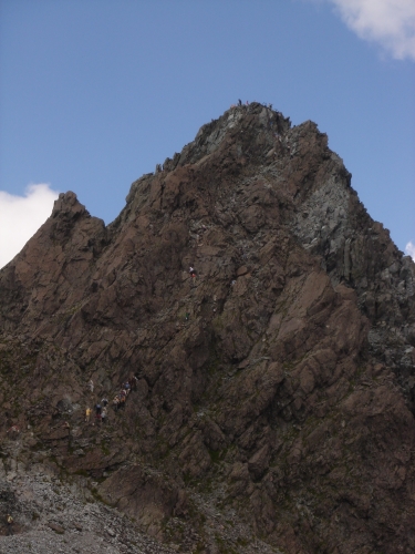 尾びやんの百名山の5回目は北アルプスの槍ケ岳(標高3180m)です!尾びやんの中では槍ケ岳は22回と一番、多く登頂している山です!槍ケ岳に一番、最初に登頂したのは、尾びやんがまだ本格的に山登りをしていない29歳の時に高校時代の友人に誘われて登った時です!その時は上高地から入り、横尾から槍ケ岳を登り、大キレットを越えて、北穂高岳から横尾に下るコースを歩きました!第1回目の登頂は雨で、まったく展望が見えなく、夏なのにとても寒い思いをした記憶が残っております!それから、東鎌尾根、西鎌尾根、北鎌尾根等と季節とコースを変えて22回登頂しましたが、不思議なことに一度も槍ケ岳の頂上からの展望は雨や濃霧や強風で展望はよくありませんでした!下の写真は平成6年の7月に新穂高温泉登山口から登った時の写真ですが、この時も槍ケ岳山荘に到着するまでは晴れていたのですが、荷物を置いて登り始めた時から段々と雲が出て来て、頂上に着いた時には濃霧の中でした!これからも槍ケ岳には挑戦して行きますが一度で良いから、槍ケ岳の頂上から快晴の大展望を見たいと思っている尾びやんです!