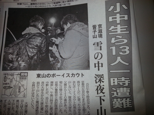今日の新聞記事に、「昨日、京都府と滋賀県の県境にまたがる皆子山(標高971m)に登った京都のボーイスカウト男女13名が下山しないと連絡があり、警察、消防が捜索したが悪天候のため中断したが、深夜の午前0時過ぎに全員下山した!」と掲載されていた!このボーイスカウトの人達、昨日の朝、バス停で尾びやんが「何処に行くの?」「みなこやま!」と話していた子供達が遭難しかけるとは尾びやんはびっくりしています!テレビのニュースでは、天候が悪化すると予想されている日に、参加者に小学生もいるのに計画に無理があったのではないか?登山計画書を提出していなかったと報道されていました!尾びやんは登山する場合は登山計画書を事前に警察に提出するか当日に登山口の登山届のポストに入れるのは登山者にとってあたりまえのことだと思います!また、参加者のメンバーにより、天候予測等考慮して当日、予定していたコースを早めに変更または中止する決断をしなければならないと思います!今回、自力で全員、けがなく無事に下山出来たことは喜ぶことであるが今後、大きな波紋を起こすのではないのかと尾びやんは感じています!