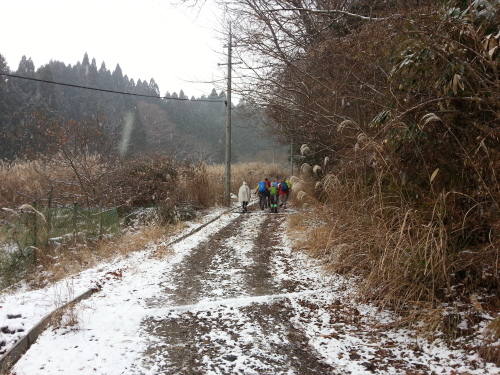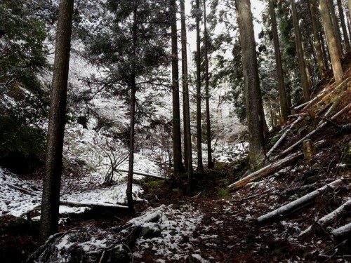 12月8日(日)尾びやんが以前、会長をしていたハイキングクラブの今年、最後の例会「雲取山(標高911m)」に参加しました!天気予報で今日は荒れるとのことで朝、出町柳駅「広河原行」のバス停に集合した参加者は11名でした!隣のバス停には一時遭難騒ぎになったボーイスカートの子供達も集合していました!バスを待っている間に「何処に行くの?」「みなこやま」て話していた子供達が一夜明けて、新聞やテレビで報道されているとは尾びやんも驚いています!花背高原前で降りた時、既に雪がちらついていました!コースは花背高原前→寺山峠→雲取峠→雲取山→立命ワンゲル小屋→二の谷→勢竜天満宮→京見坂→旧花背峠→峠下バス停を歩きました!花背高原前からの登山道に薄っすらと雪が積もっていました!寺山峠に到着した時は積雪1センチぐらいの雪景色でした!雲取峠に到着すると5センチ位の雪が積もっており、風もあって休憩している寒かったです!雲取峠からは完全に冬山で、雪景色を楽しみながら雪道を歩いて雲取山に向かいます!雲取山頂上!頂上は樹林に囲まれて展望は見られませんでしたが、雪景色は何とも言えない癒しさを感じました!雲取山からは雪景色の樹林帯の中を下って行きます!立命ワンゲル小屋前で昼食!休憩中でも雪は降っています!二の谷もすっかり雪景色! つららも見られました!勢竜天満宮(せりょうてんまんぐう)旧花背峠峠下のバス停に到着した時は雪はまったくありませんでした!今日は花背高原前から峠下バス停まで約6時間、雪景色を楽しみながらののんびりハイキングを楽しむことが出来た一日でした!