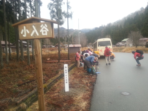 12月8日(日)尾びやんの所属している山の会の恒例の「忘年山行」です!今年は21名の会員が参加で、滋賀県の高島トレールの根来峠~三国峠を歩きます!貸切バスで登山口の小入谷バス停に到着した時はどんよりした雲で、ストレッチをしている途中からポツポツと雨が降って来る!「今日は晴れるはずではなかったのか!」「今日のリーダーは雨男やし、しかたないわ!」等ぼやきながら根来峠に向かってしばらくは舗装道を歩く!焼尾地蔵で休憩! 雨も止んだ!ここから根来峠に向かって山道に入って行く!紅葉はすっかり終わり、落葉道を登って行く!雨に濡れて、落葉の登山道は滑りやすく歩きにくいが、葉が落ちたブナ林を日頃、なかなか山行しない仲間と親睦をはかるのもなかなか良いものだと尾びやんは思っております!焼尾地蔵登山口から約30位で根来峠に到着!ここから高島トレールになる!根来峠からおにゅう峠まで700m 約15分!15分過ぎてもおにゅう峠に到着しない!「あら! おかしいぞ!」と誰もが思いながらもリーダーを信じながら着いていく!しかし、稜線上の尾根を歩かなければならないのに下っている!地図を見るとコースを間違って歩いてるのに気づく!引き返して、おにゅう峠に到着したがロスタイムが約1時間!おにゅう峠からの展望は良く、日本海が近く見えた!おにゅう峠から当初計画していた三国峠から生杉に行くには日暮れてしまうとリーダーが判断して、コースを変更して、百里新道を下って下山する!リーダーは「今回のコースは何回も来ているので油断していたのか、根来峠での分岐でコースを見落としてしまって間違った道に行ってしまって皆さんに大変、ご迷惑をおかけして申し訳ありませんでした」と言っておられましたが尾びやんも分岐の地点で確認しなかったことに反省しております!