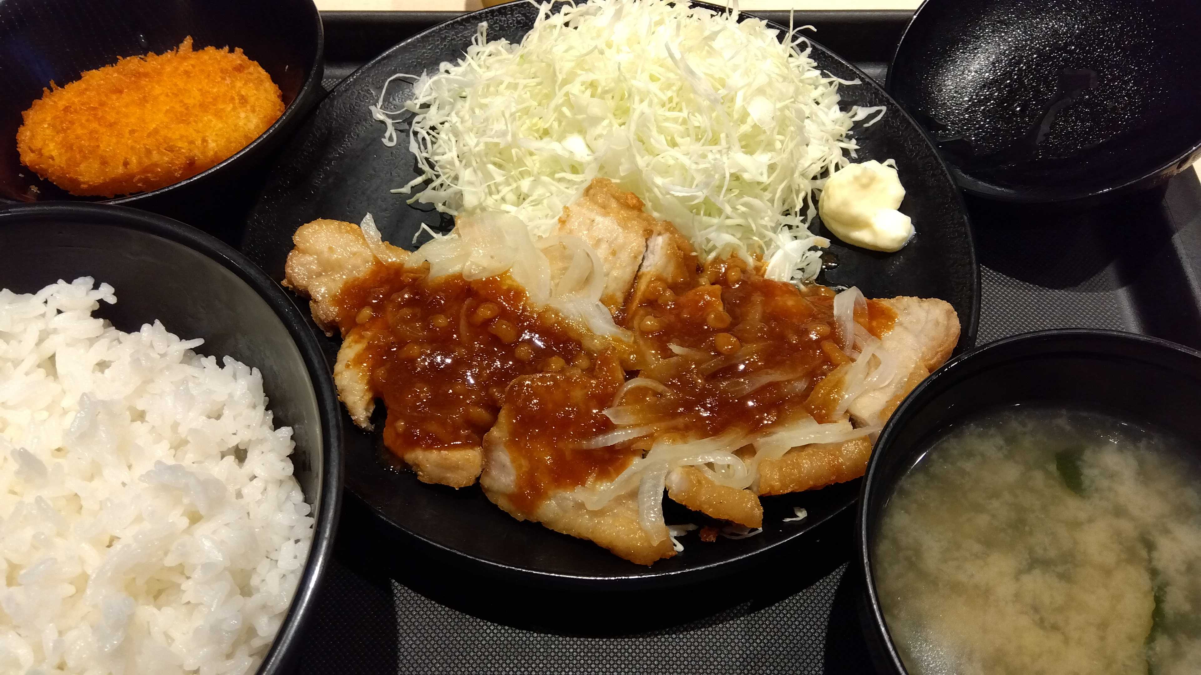 今日は、ほぼ曇り?なんか、晴れると聞いていたような気が…。気温は、ちょっと暖かめの23℃くらい(笑)まあまあな、日ですね。仕事は、ちょっと忙しかったですね。月曜日ですから、仕方ないかな?でも、何とか帳尻を合わせて、お昼に。そのあとも、ちょっと忙しかった。ま、定時前には、ゆっくりできましたが。帰り道は、地元で。松のやで、背脂生姜タレのポークステーキ定食を、サービスコロッケ付きで。背脂生姜タレのポークステーキ定食先週から出てきた期間限定メニューですね。これは、やっぱりごはんが欲しくなるメニュー。久しぶりに、ごはんは大盛にしましたが、問題なく完食(笑)たぶん、若い人ならば、ごはんのお替りもできるのでしょうね。ここは、ごはんお替りサービスですからね。私が、食べている間も、何人かが、お替りを(笑)しかも、大盛で。満足ですね。
