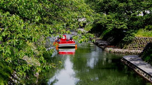 青葉を下から見上げて楽しむ遊覧船に乗る人々や、そんな人間を見守る鷺や鴨・・・どっちが見ているか・・・見られているか![]()