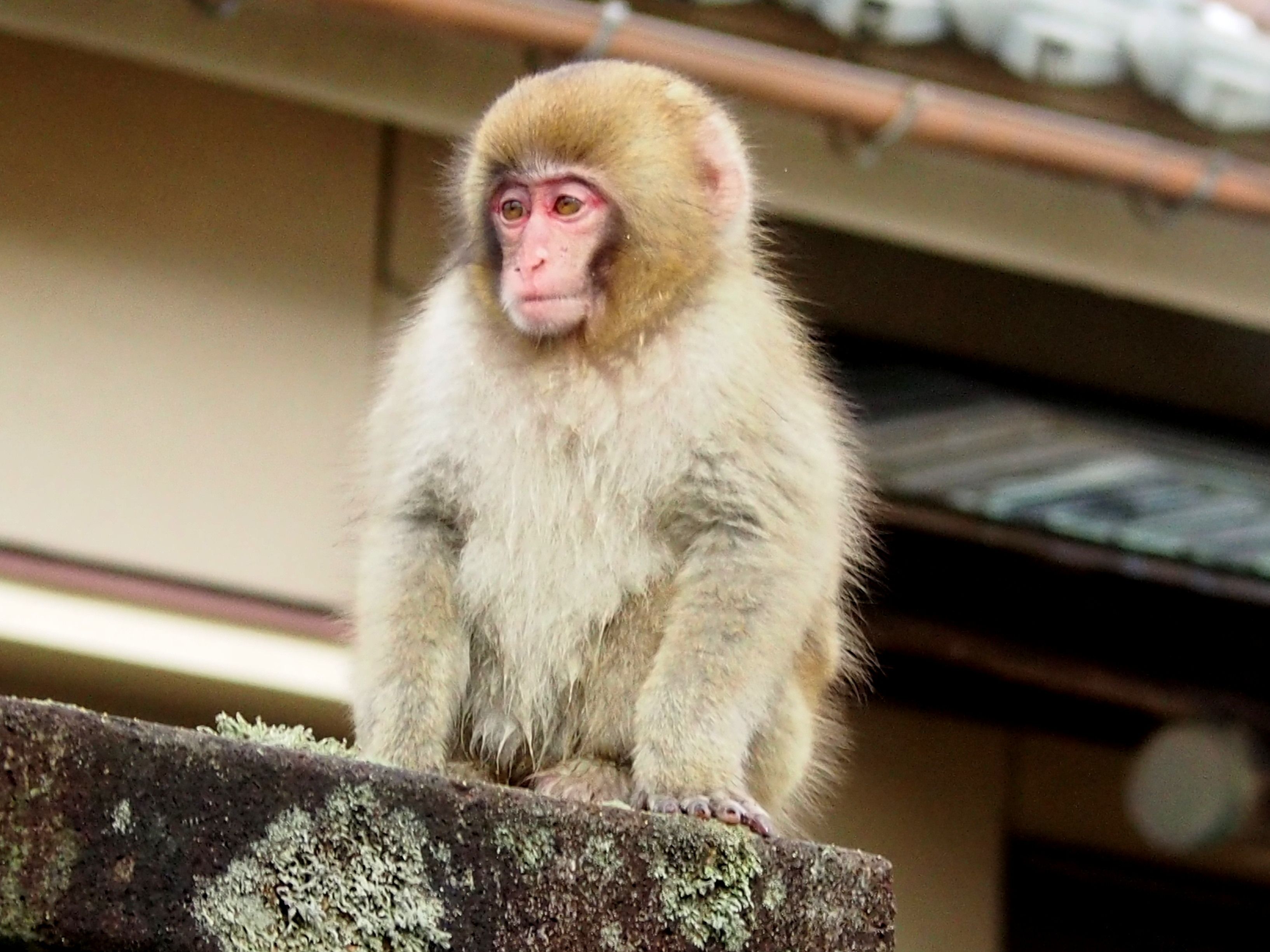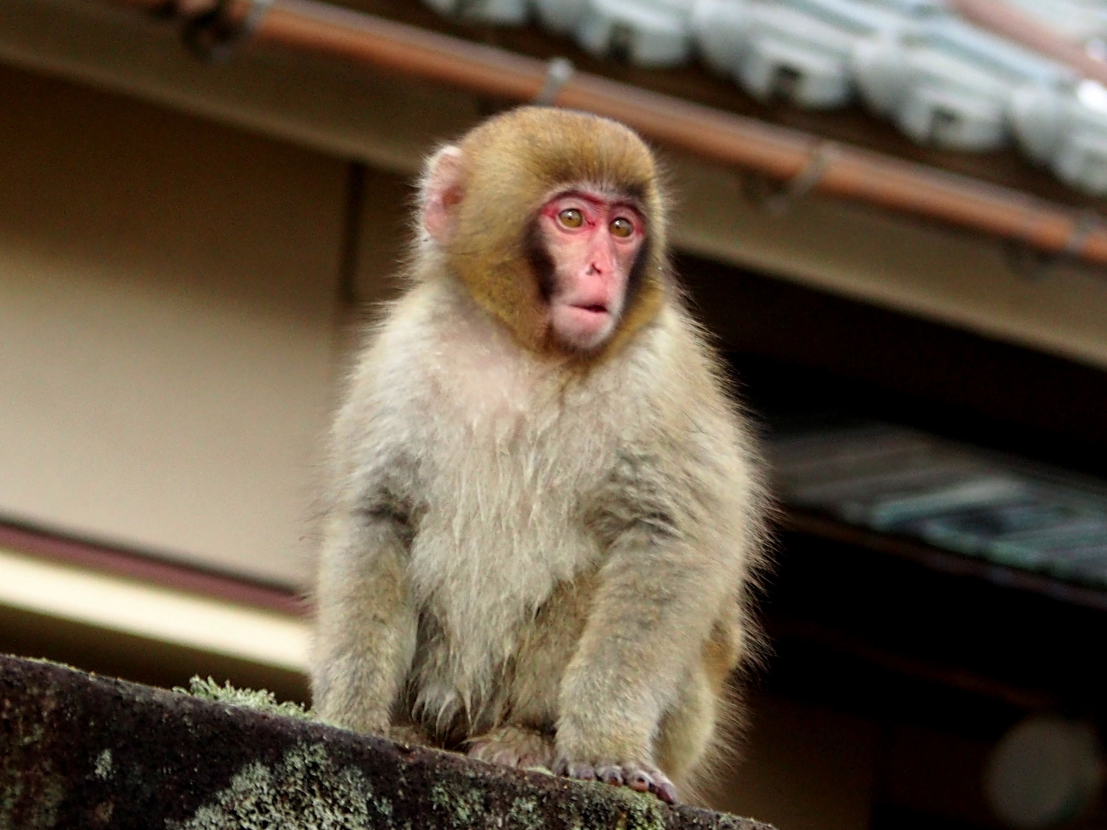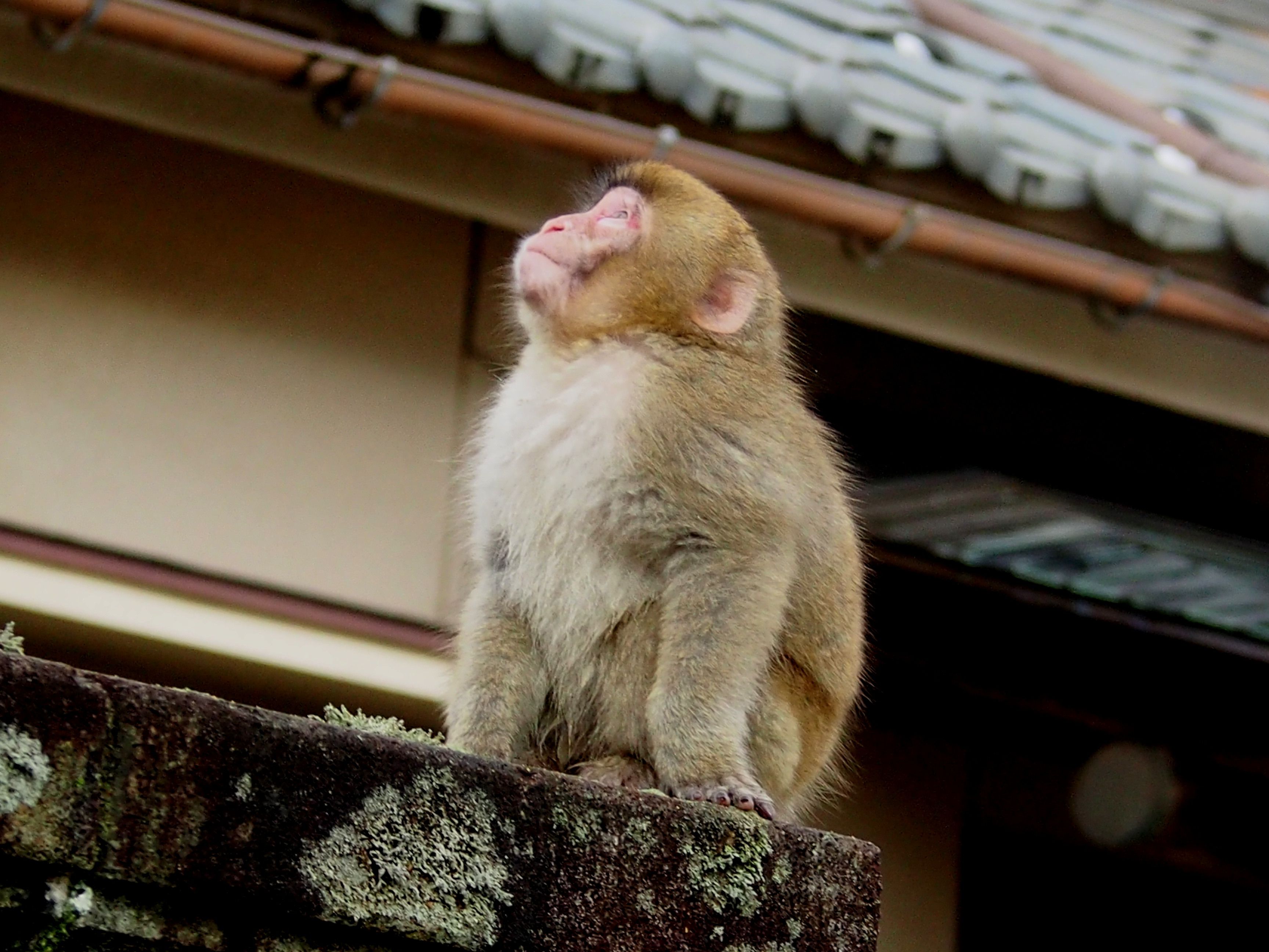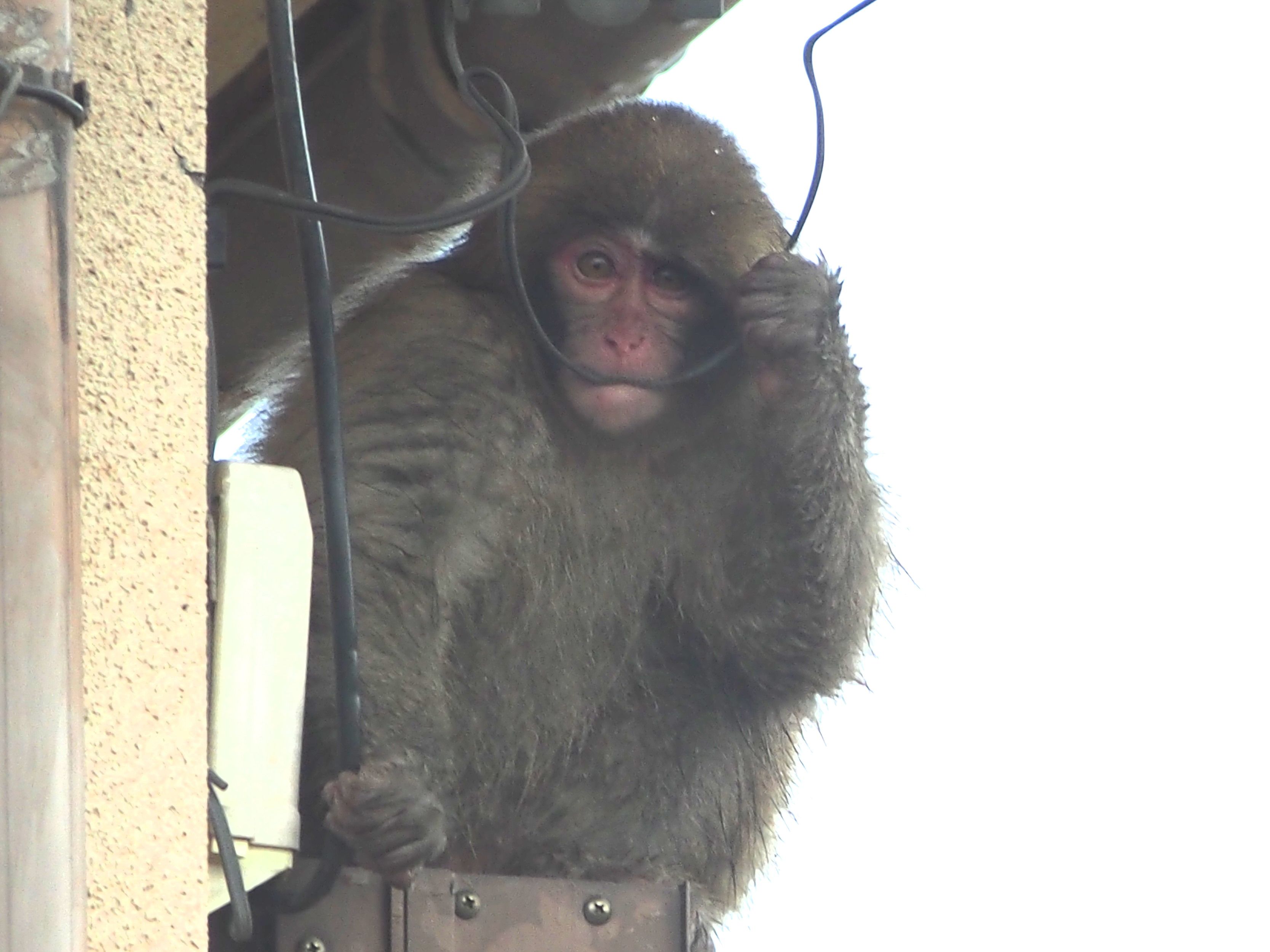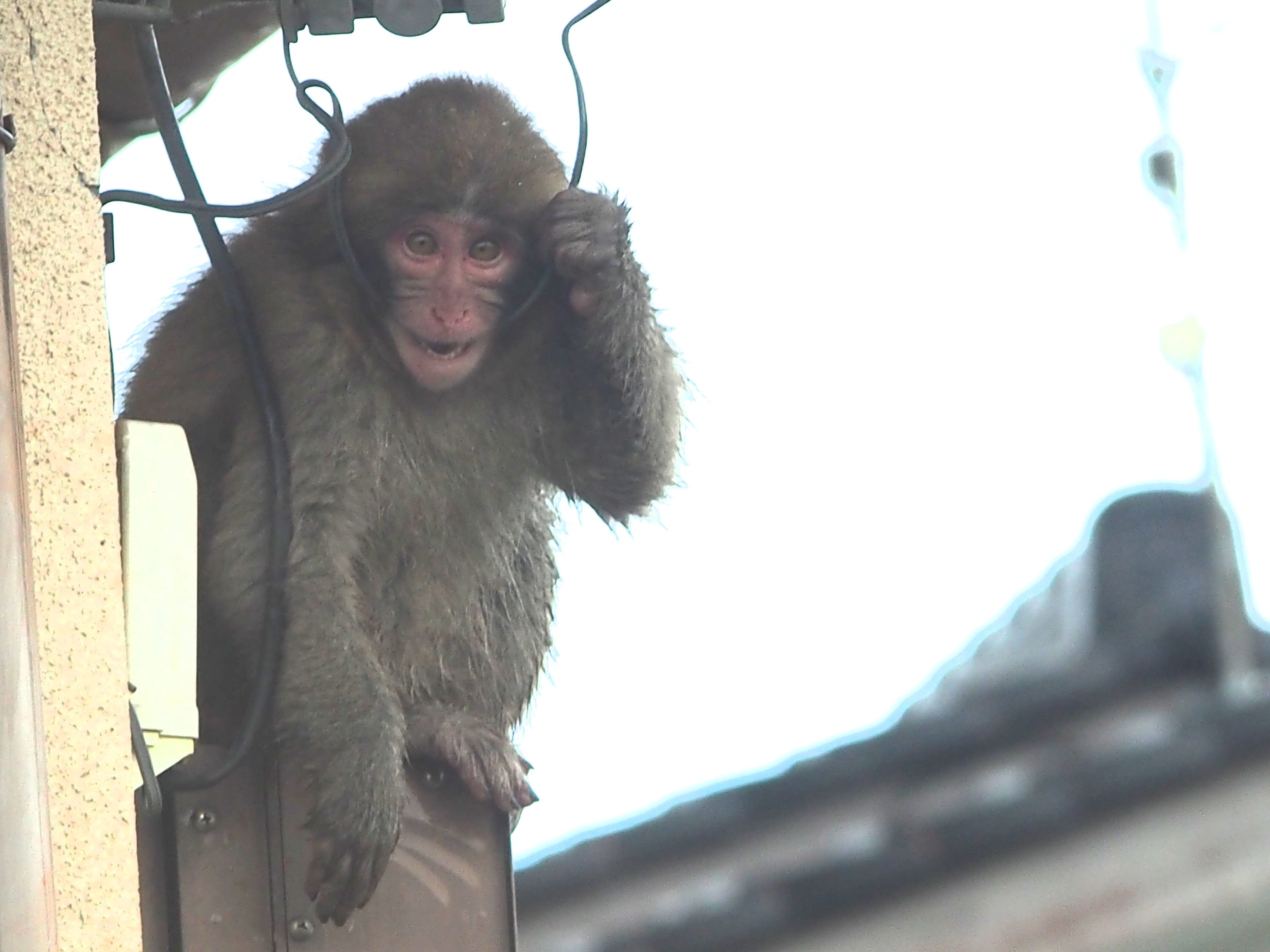 相手は猿、もちろん野生の猿です。顔を見るとまだふてぶてしさの感じられない子猿に毛がはえた程度でしょうかちょっと可愛くて「キュート」って叫びたくなるくらい(ちょっと不謹慎かな) 食べ物がなくてお腹が空いたのか里へ出てきた様子…もう何か齧りたかったのか、それとも人間の赤ちゃんみたいに『おしゃぶり』したかったのか、アンテナ線と思しき線を齧ったり咥えていたのにはビックリびっくりかと思うと、塀の上で物思い気に空を見上げているのもいて、総勢数匹の群れをしばし見つめていました。彼らはすっかり人に慣れているのか、こちらに全く気にしない様子「撮りたかったら撮れば・・・」って感じでした。