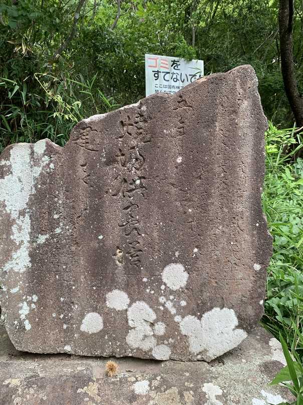 さらに緩やかに上り坂を進んでいくと、すぐに三叉路に出る。なお、東西の二本に分かれる散策路は、三共堤の外周をまわり、北のキャンプ場で合流するのだ。東(北に向かって右)に延びる園路が秀衡街道だろう。この三叉路の山側(北)斜面に、上部が欠けた自然石の「焼場供養塔」(コレラ塔)がある。276人の供養碑だ。