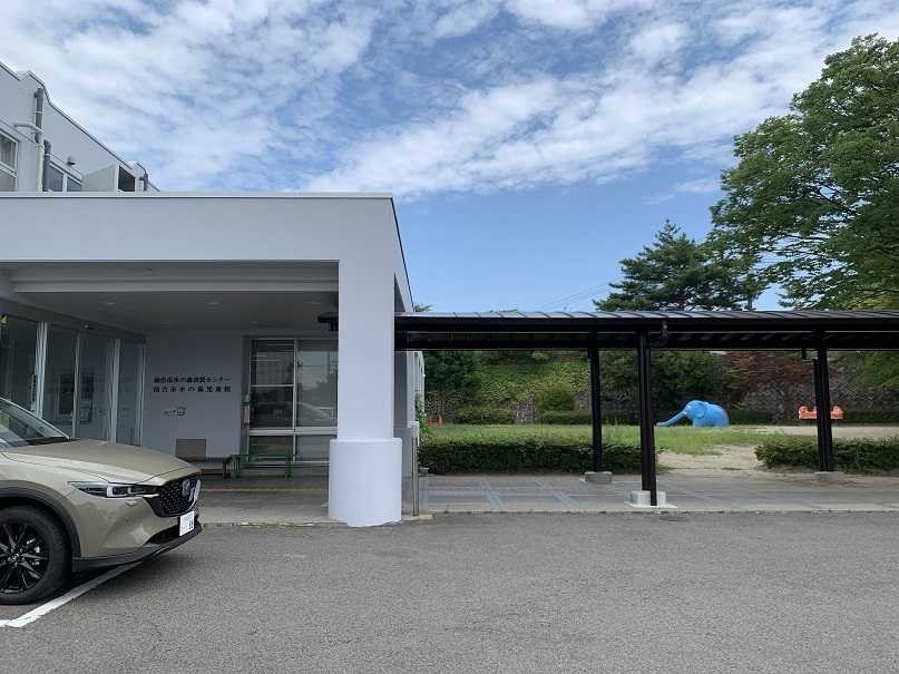 (↑水の森市民センター。右側の園庭の奥の法面の上が散策路だ)