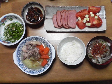 今日は鶏とジャガイモ煮込みがメイン?鶏肉とジャガイモと人参を煮込み、塩麹で味付けしたものです。コショーで頂きます。ミニ鰻?七味をトッピング・・家人たちの食べた余りのようです。オクラも頂きます。味噌汁は舞茸とネギ・・トマトと焼豚風ハム?オリーブ油とチーズをトッピング・・今日は色々と頂きました。