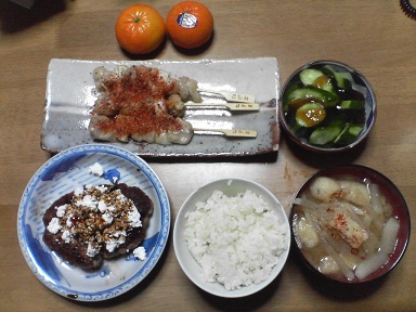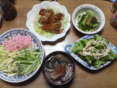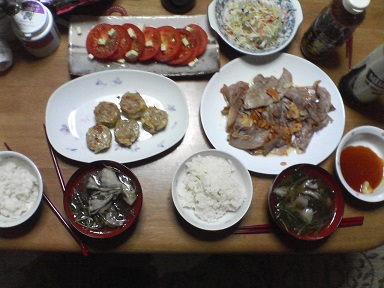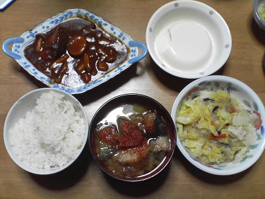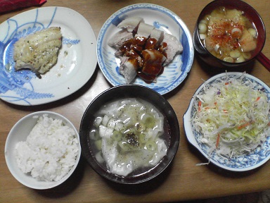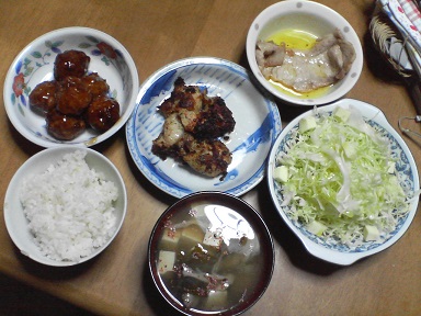 今日は鶏肉と豚肉・・・鶏の香味焼き。市販の味付け品です。肉団子も頂きます。昨日、食べきれなかった豚肉・・残り一枚?味噌汁はワカメと豆腐と舞茸・・・キャベツサラダも頂きます。オリーブ油とチーズをトッピング・・・今日もおいしく頂きました。