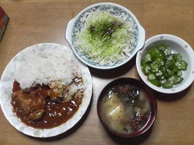 今日はカレー。家人作成のチキンカレー。甘口です。オクラも頂きます。味噌汁はジャガイモとワカメ・・・キャベツサラダも頂きます。余っていた焼そばの青のりをトッピング・・・今日もおいしく頂きました。
