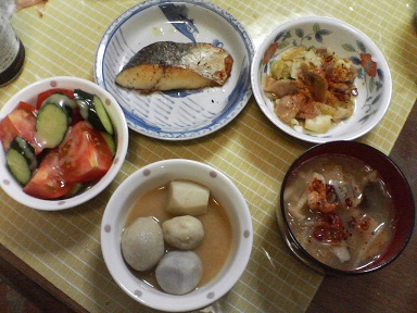 今日は鰆と里芋・・・フライパンで焼いた鰆・・・豚肉とキャベツの炒め物も頂きます。味噌味の里芋・・・モヤシと舞茸の味噌汁も頂きます。胡瓜とトマトのサラダも頂きます。今日もおいしく頂きました。