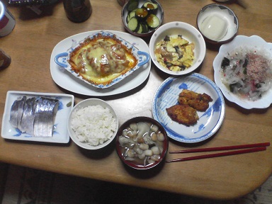 今日のおかずは少しずつ色々・・とりあえず、ポテトフライに余っていたパスタのミートソースとチーズをかけたものを焼きます。オーブンで5分ほど焼いて完成。鶏のカレー焼き。鶏肉と卵の炒め物も頂きます。市販の素を利用・・・味噌汁は舞茸と豆麩・・・玉葱サラダも頂きます。少々辛かったです。胡瓜も頂きます。なぜか〆鯖付き・・・とりあえず、お腹いっぱい・・・今日もおいしく頂きました。