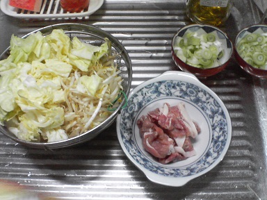 今日はやきそば。豚肉、キャベツ、モヤシなどを用意・・・フライパンにオリーブ油とスライスにんにくを入れ、豚肉と長葱から炒めます。キャベツ、モヤシを入れます。火が通ったら、麺とソースを入れて炒めます。完成。平行して味噌汁も作ります。今日は豆苗と揚げ豆腐・・・鍋に昆布とかつおダシを入れ、豆苗と揚げ豆腐を煮込みます。スライスにんにくと味醂も入れます。味噌を入れて完成。早速頂きます。今日は泳いできたので、少々くたびれました。たくさん食べてパワーアップ・・・