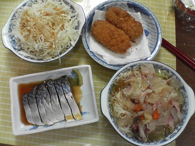今日はスープヌードル?実はそうめんが余っていたので、濃いめのスープをかけて頂きました。細麺にはスープが合うようです。〆鯖も頂きます。なぜかコロッケも・・・キャベツサラダも頂きます。いつもはここまでですが、今日はお腹がすいていたので、追加でポテトを揚げて頂きます。コロッケを揚げた油が余っていたので、そのまま流用・・・ポテトが揚がったところでビールも頂きます。うーん、おなかいっぱい。少し食べ過ぎてしまいました。