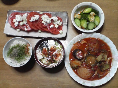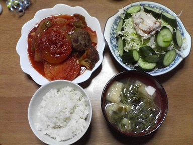 今日は煮込ハンバーグとサラダ・・・煮込ハンバーグというよりは煮込玉葱??茄子とブロッコリーも入っています。味噌汁はワカメと豆腐・・・胡瓜にニンニクの油漬けを乗せてみました。トマトサラダ。チーズとオリーブ油で頂きます。今日は洋風? 味噌汁は和風?少々油の摂り過ぎ?オリーブ油だから大丈夫??