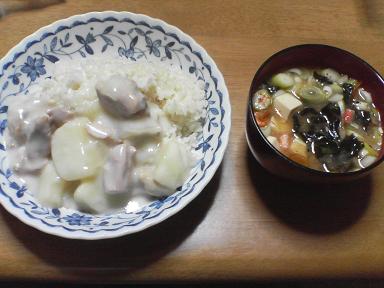 今日はシチュー。家人作成・・ジャガイモと鶏肉がメインのホワイトシチュー・・味噌汁はナメコと豆腐とワカメ?ネギも入っています。今日は忙しく、遅い夕飯でした。