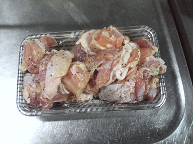 今日は鶏肉・・・市販の素を振りかけて、しばらく放置します。レモンソルト味?フライパンにオリーブ油を入れ、鶏肉を焼きます。弱火でじっくり火を通します。完成。次は唐揚げ風味?こちらもじっくり火を通します。完成。早速、頂きます。味噌汁はワカメ。今日もおいしく頂きました。
