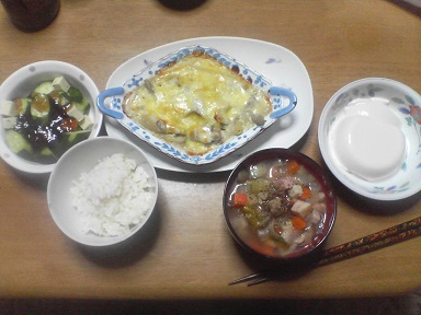 今日はグラタン。舞茸と鶏肉、玉葱入り・・人参、玉葱、ジャガイモ、セロリ、ベーコンなどを煮込んだスープ。胡瓜も頂きます。青しそのジュレをトッピング・・・今日もおいしく頂きました。