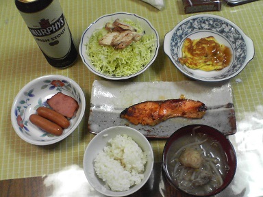 今日はシャケとその他諸々・・・シャケの粕漬け・・焦げやすいので、弱火でじっくり焼きます。ソーセージとハム。おつまみ用・・・卵も頂きます。味噌汁は、舞茸とモヤシとあぶらげ・・・キャベツサラダも頂きます。鶏のトッピング付き・・・今日もおいしく頂きました。