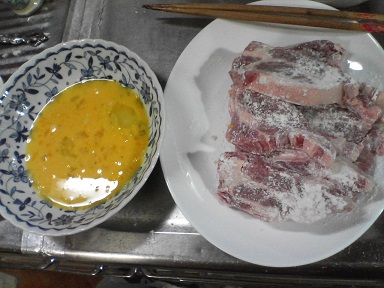 今日はとんかつ。ブロック肉を切って作ります。小麦粉をかけ、卵を通し、パン粉をつけます。サラダ油とオリーブ油を混ぜて使います。5~6分ほど揚げます。完成。早速頂きます。味噌汁はモヤシとあぶらげ・・・今日もおいしく頂きました。