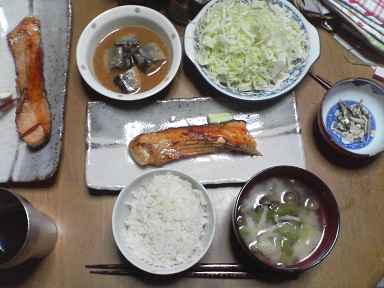 今日はシャケ。フライパンにオリーブ油を入れ、シャケを焼きます。分厚いので、弱火でじっくり火を通します。完成。味噌汁はシメジ・・・キャベツも頂きます。今日は泳いできたので、少々疲れ気味でした。たくさん食べてパワーアップ??