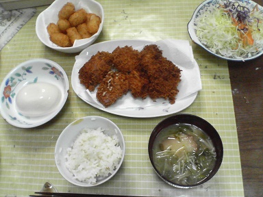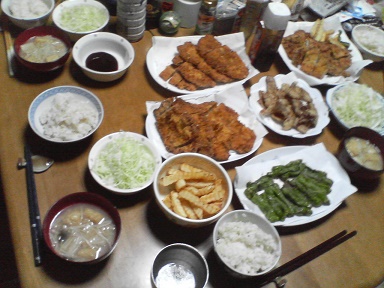 今日は揚物などを頂きます。まずはトンカツ、卵、小麦粉、パン粉をつけます。油で揚げます。適当にカットします。完成。ポテトフライも頂きます。ししとうの素揚げ・・鶏皮も・・味噌汁はエノキとあぶらげ・・キャベツサラダも頂きます。今日もおいしく頂きました。