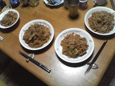 今日は焼きそばなどを頂きます。フライパンにオリーブ油を入れ、豚肉、玉葱、ピーマン、キャベツなどを炒めます。なぜかエノキも?モヤシを加えます。定番の1kg・・火が通ったら、麺とソースを加えて混ぜ合わせます。完成。今日もおいしく頂きました。