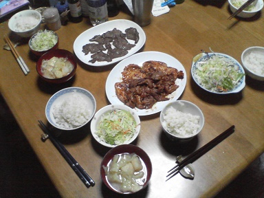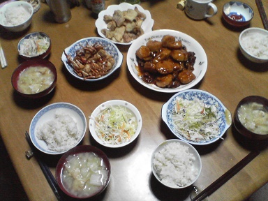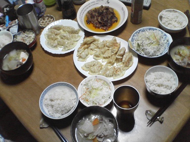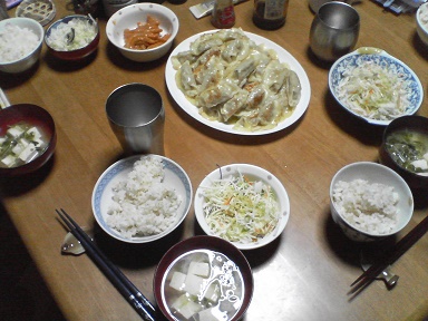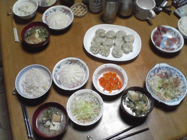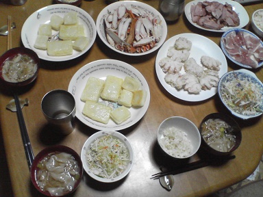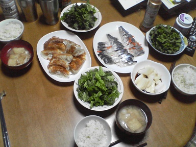 今日は餃子などを頂きます。普通の餃子・・〆鯖も頂きます。山芋のスライス、ポン酢で頂きます。味噌汁はシメジとあぶらげ・・サラダも頂きます。今日もおいしく頂きました。