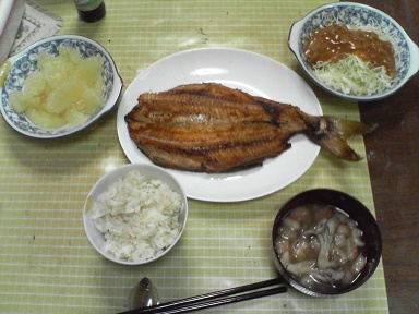 今日はホッケなどを頂きます。フライパンにオリーブ油を入れホッケの開きを焼きます。じっくり焼いて完成。味噌汁は舞茸と豆麩・・キャベツサラダも頂きます。グレープフルーツも・・今日もおいしく頂きました。